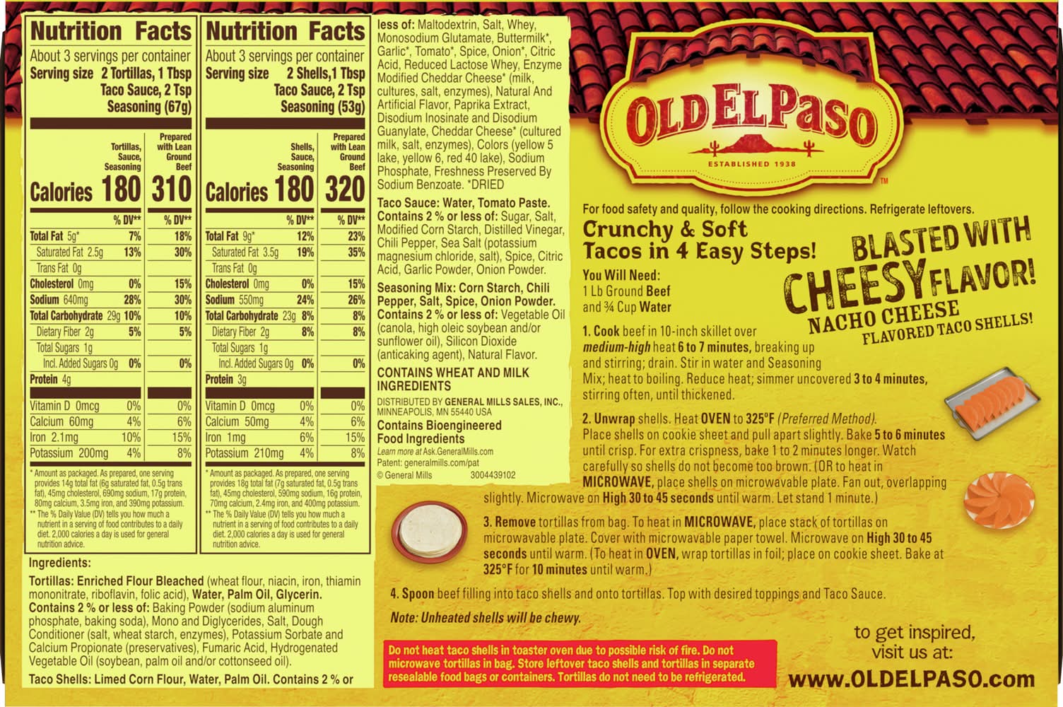 Tortillas: Enriched Flour Bleached (Wheat Flour, Niacin, Iron, Thiamin Mononitrate, Riboflavin, Folic Acid), Water, Palm Oil, Glycerin. Contains 2% or Less of: Baking Powder (Sodium Aluminum Phosphate, Baking Soda), Mono and Diglycerides, Salt, Potassium Sorbate and Calcium Propionate (Preservatives), Fumaric Acid, Hydrogenated Vegetable Oil (Soybean, Palm, and/or Cottonseed Oil), Dough Conditioner (Salt, Wheat Starch, Enzymes). Taco Shells: Limed Corn Flour, Palm Oil. Contains 2% or Less of: Salt, Maltodextrin, Whey, Buttermilk (Dried), Reduced Lactose Whey, Monosodium Glutamate, Natural and Artificial Flavor, Garlic (Dried), Dextrose, Canola Oil, Tomato (Dried), Citric Acid, Onion (Dried), Cheddar Cheese (Dried) (Cultured Milk, Salt, Enzymes), Sodium Phosphate, Colors (Yellow 5 & 6, Yellow 6 Lake, Red 40 Lake, and Other Color Added), Whey Protein Concentrate, Spices, Disodium Inosinate and Guanylate, Lactic Acid, Nonfat Milk, Freshness Preserved by Sodium Benzoate. Taco Sauce: Water, Tomato Paste. Contains 2% or Less of: Sugar, Salt, Modified Corn Starch, Distilled Vinegar, Spice, Sea Salt (Potassium Magnesium Chloride, Salt), Citric Acid, Garlic Powder, Onion Powder, Chili Pepper. Seasoning Mix: Chili Pepper, Salt, Corn Starch, Onion Powder, Spice, Sea Salt (Potassium Magnesium Chloride, Salt), Maltodextrin. Contains 2% or Less of: Vegetable Oil (Canola Oil and/or High Oleic Soybean Oil), Corn Flour, Silicon Dioxide (Anticaking Agent), Citric Acid, Sugar, Natural Flavor. Contains: Wheat, Corn, Milk, Lactose, Soybeans