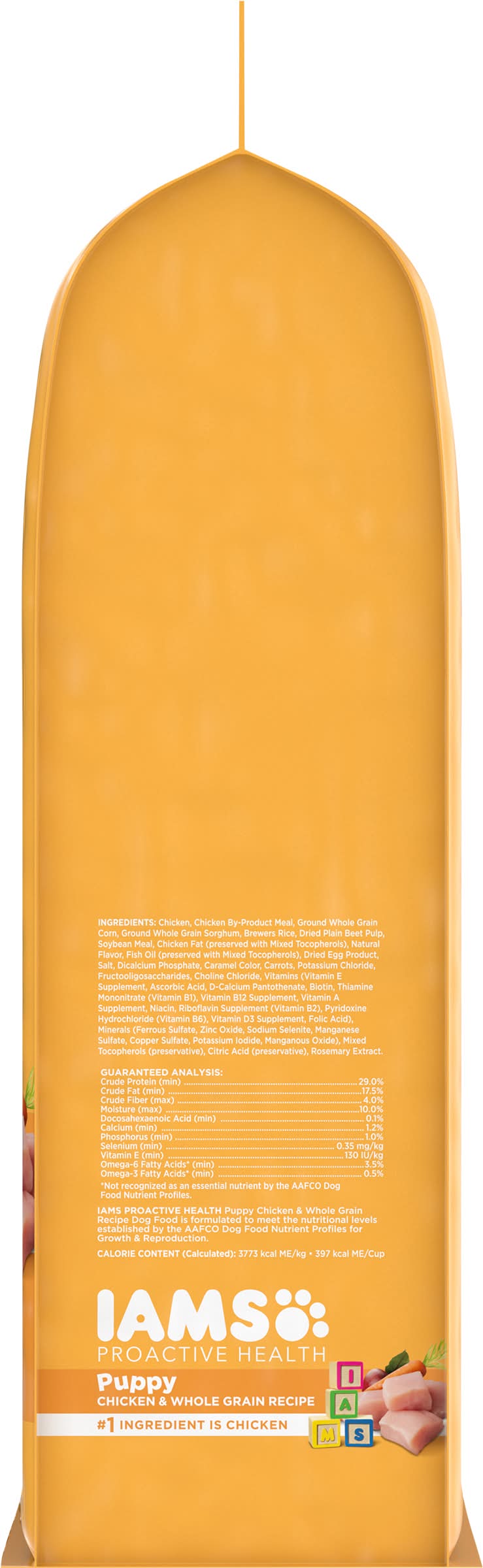 Directions: best if used by date on bag. 100% complete & balanced for growth of small and medium sized puppies. recommended daily feeding guide: weight of dog: 3 lbs (1 kg); weaning to 3 months: 3/4 cup (79 grams); 3 to 6 months: 2/3 cup (70 grams); 6 to 9 months: 1/2 cup (53 grams); 9 to 12 months: transition to adult. weight of dog: 5 lbs (2 kg); weaning to 3 months: 1 cup (105 grams); 3 to 6 months: 1 cup (105 grams); 6 to 9 months: 3/4 cup (79 grams); 9 to 12 months: transition to adult. weight of dog: 10 lbs (5 kg); weaning to 3 months: 2 cups (211 grams); 3 to 6 months: 1-2/3 cups (175 grams); 6 to 9 months: 1-1/3 cups (140 grams); 9 to 12 months: transition to adult. weight of dog: 15 lbs (7 kg); weaning to 3 months: 2-1/2 cups (263 grams); 3 to 6 months: 2-1/4 cups (237 grams); 6 to 9 months: 2 cups (211 grams); 9 to 12 months: transition to adult. weight of dog: 20 lbs (9 kg); weaning to 3 months: 3-1/4 cups (342 grams); 3 to 6 months: 2-3/4 cups (290 grams); 6 to 9 months: 2-1/3 cups (246 grams); 9 to 12 months: transition to adult. weight of dog: 30 lbs (14 kg); weaning to 3 months: 4-1/4 cups (447 grams); 3 to 6 months: 3-3/4 cups (395 grams); 6 to 9 months: 3-1/4 cups (342 grams); 9 to 12 months: 2-2/3 cups (281 grams). weight of dog: 40 lbs (18 kg); weaning to 3 months: 5-1/3 cups (562 grams); 3 to 6 months: 4-2/3 cups (491 grams); 6 to 9 months: 4 cups (421 grams); 9 to 12 months: 3-1/4 cups (342 grams). weight of dog: 50 lbs (23 kg); weaning to 3 months: 6-1/4 cups (658 grams); 3 to 6 months: 5-1/2 cups (579 grams); 6 to 9 months: 4-2/3 cups (491 grams); 9 to 12 months: 3-3/4 cups (395 grams). mix with wet: replace 1 cup (105 g) for each can of iams puppy classic ground with chicken & rice (369g). lbs = pounds; kg = kilograms; c = cups; g = grams; 1 c = 105 g. feeding guidelines: these guideline amounts are a starting point and your puppy may need more food depending upon age, activity and temperament. in order to reach optimal body condition, you may need to adjust food intake. this represents the total recommended volume of food per day. you should divide the total recommended feeding amount by the number of times you feed your puppy per day to get the actual portion size per feeding. remember to have clean, fresh water available for your puppy at all times. this recipe is recommended for small and medium breed puppies up to 12 months of age as well as pregnant or nursing dogs of all breed types. during the last three weeks of gestation, increase feeding amounts by 25% to 50%. during lactation, feed as much as she wants (usually two to five times the guideline amount, depending on litter size). because iams proactive health puppy food is complete and balanced, you do not need to add vitamin or mineral supplements. when introducing iams proactive health puppy food, gradually mix it with your puppy's current food over the course of 4 days.