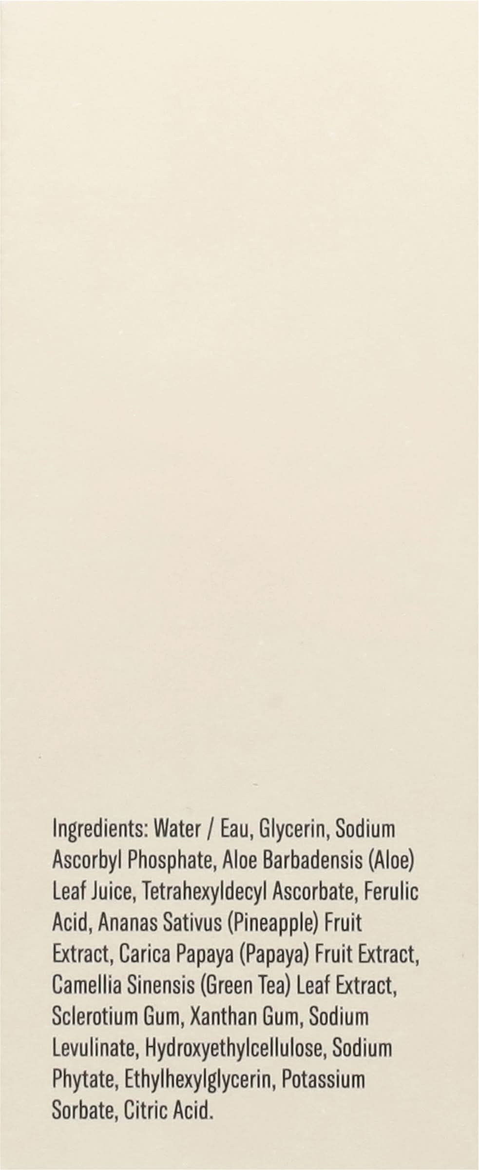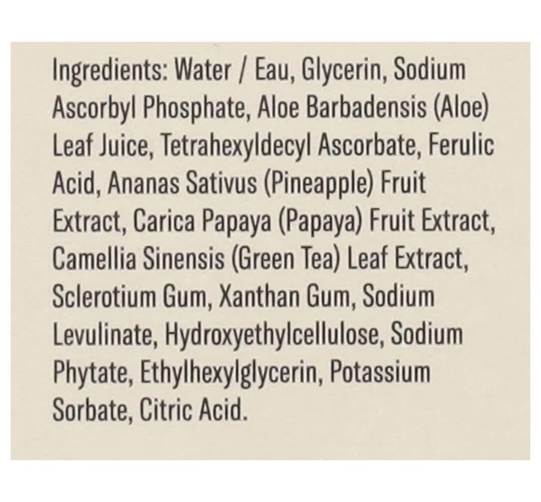 Ingredients: Water/Eau, Glycerin, Sodium Ascorbyl Phosphate, Aloe Barbadensis (Aloe) Leaf Juice, Tetrahexyldecyl Ascorbate, Ferulic Acid, Ananas Sativus (Pineapple) Fruit Extract, Carica Papaya (Papaya) Fruit Extract, Camellia Sinensis (Green Tea) Leaf Extract, Sclerotium Gum, Xanthan Gum, Sodium Levulinate, Hydroxyethylcellulose, Sodium Phytate, Ethylhexylglycerin, Potassium Sorbate, Citric Acid