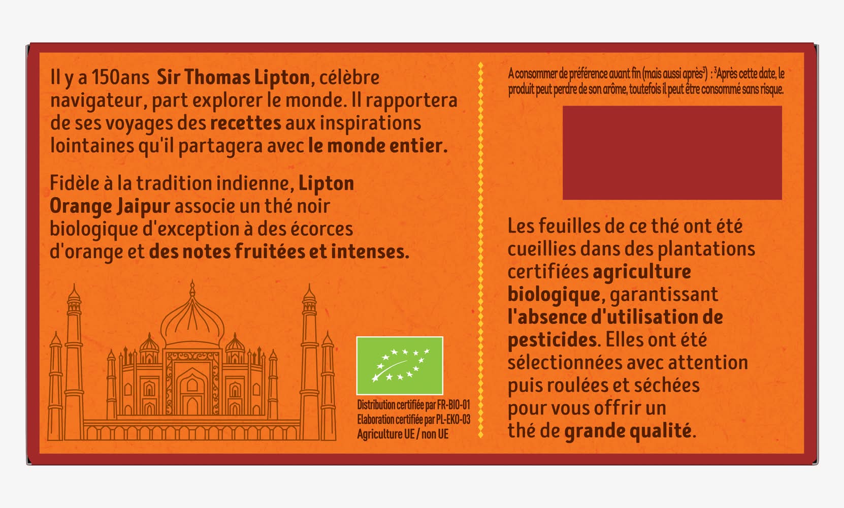 Fidèle à la tradition indienne, le thé noir Lipton® Orange Jaipur Bio associe un thé noir bio d'exception à des écorces d'orange et des notes fruitées et intenses. Tout le savoir-faire de Sir Thomas Lipton est réuni dans un thé bio d'exception issu de feuilles 100% d'origine naturelle et sélectionnées avec attention. Les feuilles de thé présentes dans cette boîte ont été cueillies dans les plantations certifiées Rainforest Alliance et sélectionnées avec attention pour vous offrir du thé de grande qualité. Elles ont ensuite été soigneusement emballées dans des sachets mousseline pour s'épanouir librement et libérer toutes leurs saveurs. Les feuilles de thé sont issues de l'Agriculture Biologique. Pour une dégustation parfaite, versez 200 ml d'eau à 100 °C, sans lait ni sucre et laissez infuser votre thé bio pendant 3 à 5 mn. Depuis sa création par Sir Thomas Lipton, la marque Lipton® s’engage pour l’environnement et le développement durable. Lipton® a été la première marque de thé à avoir sa propre plantation certifiée Rainforest Alliance – une ONG indépendante et experte en agriculture durable. En effet, la plantation Lipton® de Kericho, au Kenya, est certifiée Rainforest Alliance depuis 2007. Aujourd’hui, 100 % des thés Lipton® sont certifiés Rainforest Alliance. L’objectif de Lipton® : vous offrir des thés de qualité, tout en respectant l’environnement et en limitant notre empreinte écologique. Plus de cent ans de réussites et d'innovations, comme l’invention du sachet double chambre puis du sachet Pyramid®, ont permis à Lipton® d'apporter davantage de plaisir autour du thé à plus de personnes dans le monde. Lipton® est engagé dans la filière du développement durable avec sa certification Rainforest Alliance. La totalité du thé Lipton® provient de plantations certifiées Rainforest Alliance pour un thé plus respectueux des cultivateurs et de l’environnement. Lipton® s'est engagé à soutenir les petits exploitants agricoles à travers sa politique durable. Notre histoire : Quand Sir Thomas Lipton fonda sa société à la fin du 19? siècle, il acheta sa première plantation de thé à Ceylan (Sri Lanka). Plus de cent ans après, Lipton possède des milliers d'hectares de théiers de qualité en Afrique orientale. Bâti sur une expérience de plus d'un siècle en matière de culture et de mélange de thé, Lipton a conservé l'amour de Sir Thomas pour l'innovation et l'excellence. Lipton s’appuie sur des valeurs solides inspirées par son fondateur : naturalité, optimisme et dynamisme. Dans cet esprit d’inventivité, de recherche et de découverte, Lipton contribue à faire découvrir les bienfaits du thé infusé, thé noir ou thé vert. Marque moderne et éloignée des codes traditionnels du « tea-time », Lipton a fondé son succès sur le développement d’une « expérience de dégustation » basée sur des moments de plaisirs partagés, de découvertes et de convivialité. La totalité du thé Lipton provient de plantations vérifiées Rainforest Alliance pour un thé plus respectueux des cultivateurs et de l’environnement. Certifié Agriculture Biologique. • Unilever, LIPTON Relation Consommateurs Unilever France, 92842 Rueil-Malmaison Cedex • Packaging: Reusable
