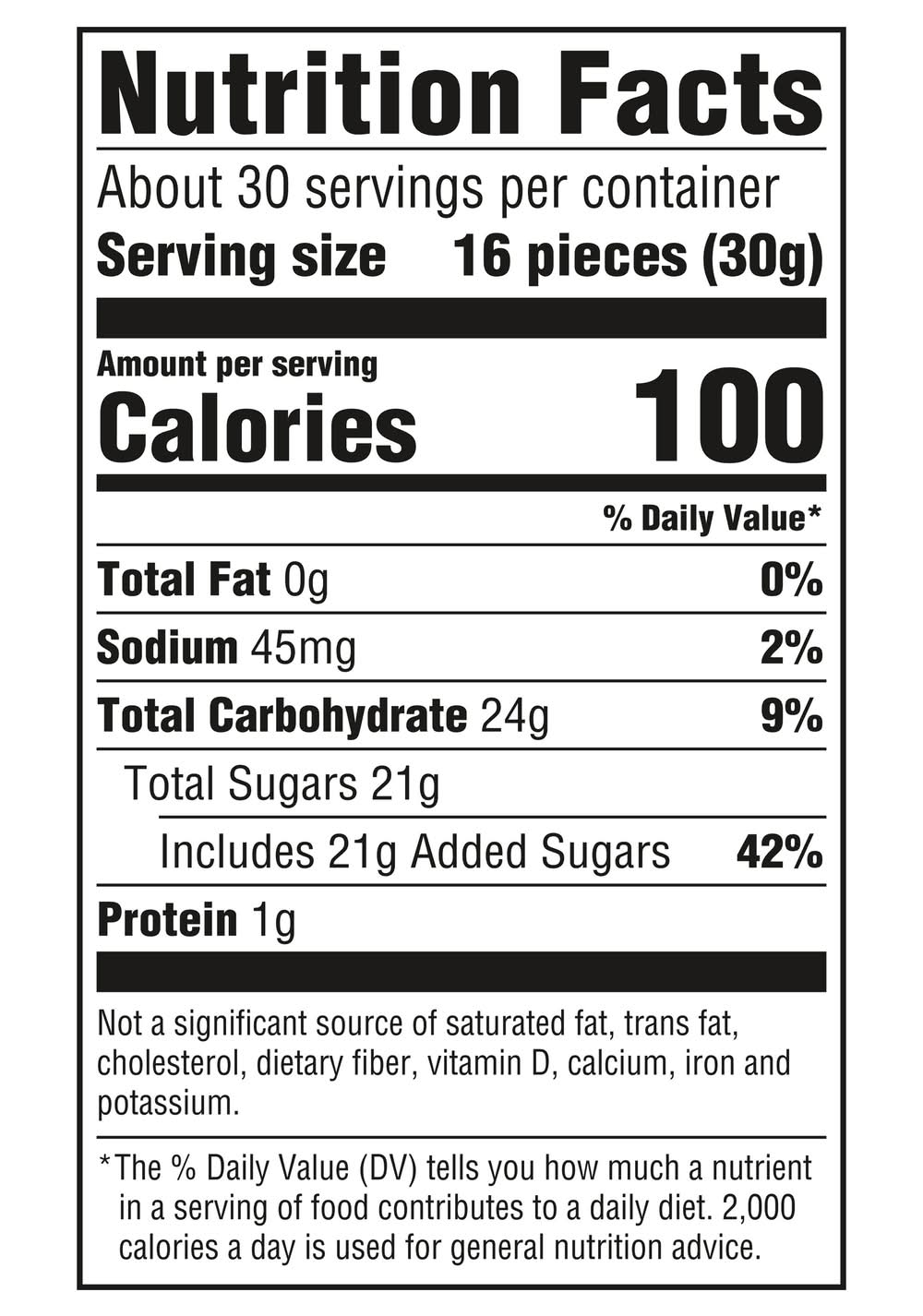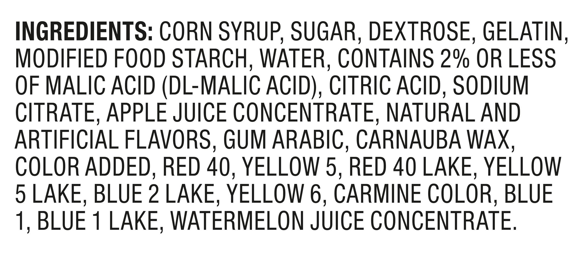 Corn Syrup, Sugar, Dextrose, Gelatin, Modified Food Starch, Water, Contains 2% or Less of Malic Acid (DL-Malic Acid), Citric Acid, Sodium Citrate, Apple Juice Concentrate, Natural and Artificial Flavors, Gum Arabic, Carnauba Wax, Color Added, Red 40, Yellow 5, Red 40 Lake, Yellow 5 Lake, Blue 2 Lake, Yellow 6, Carmine Color, Blue 1, Blur 1 Lake, Watermelon Juice Concentrate Contains: Corn, Milk, Eggs, Tree Nuts, Peanuts, Wheat, Soybeans