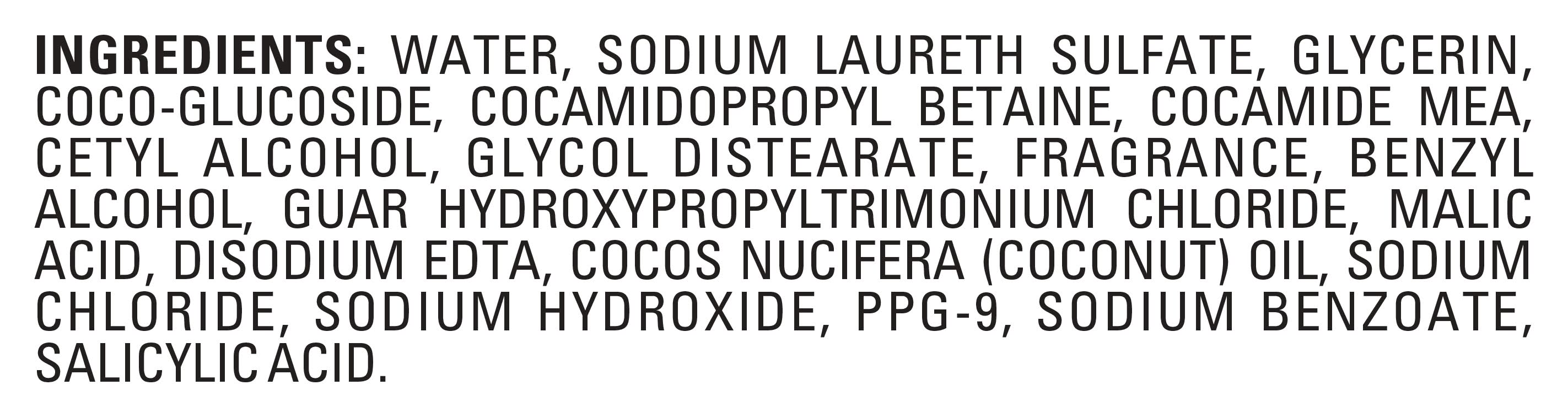 WATER, SODIUM LAURETH SULFATE, GLYCERIN, COCO-GLUCOSIDE, COCAMIDOPROPYL BETAINE, COCAMIDE MEA, CETYL ALCOHOL, GLYCOL DISTEARATE, FRAGRANCE, BENZYL ALCOHOL, GUAR HYDROXYPROPYLTRIMONIUM CHLORIDE, MALIC ACID, DISODIUM EDTA, COCOS NUCIFERA (COCONUT) OIL, SODIUM CHLORIDE, SODIUM HYDROXIDE, PPG-9, SODIUM BENZOATE, SALICYLIC ACID Contains: 'Contains Tree Nuts'