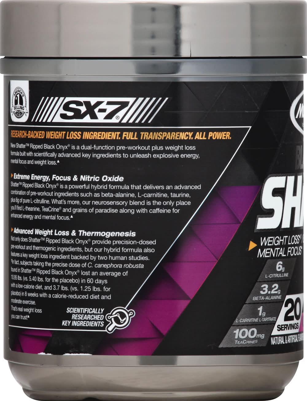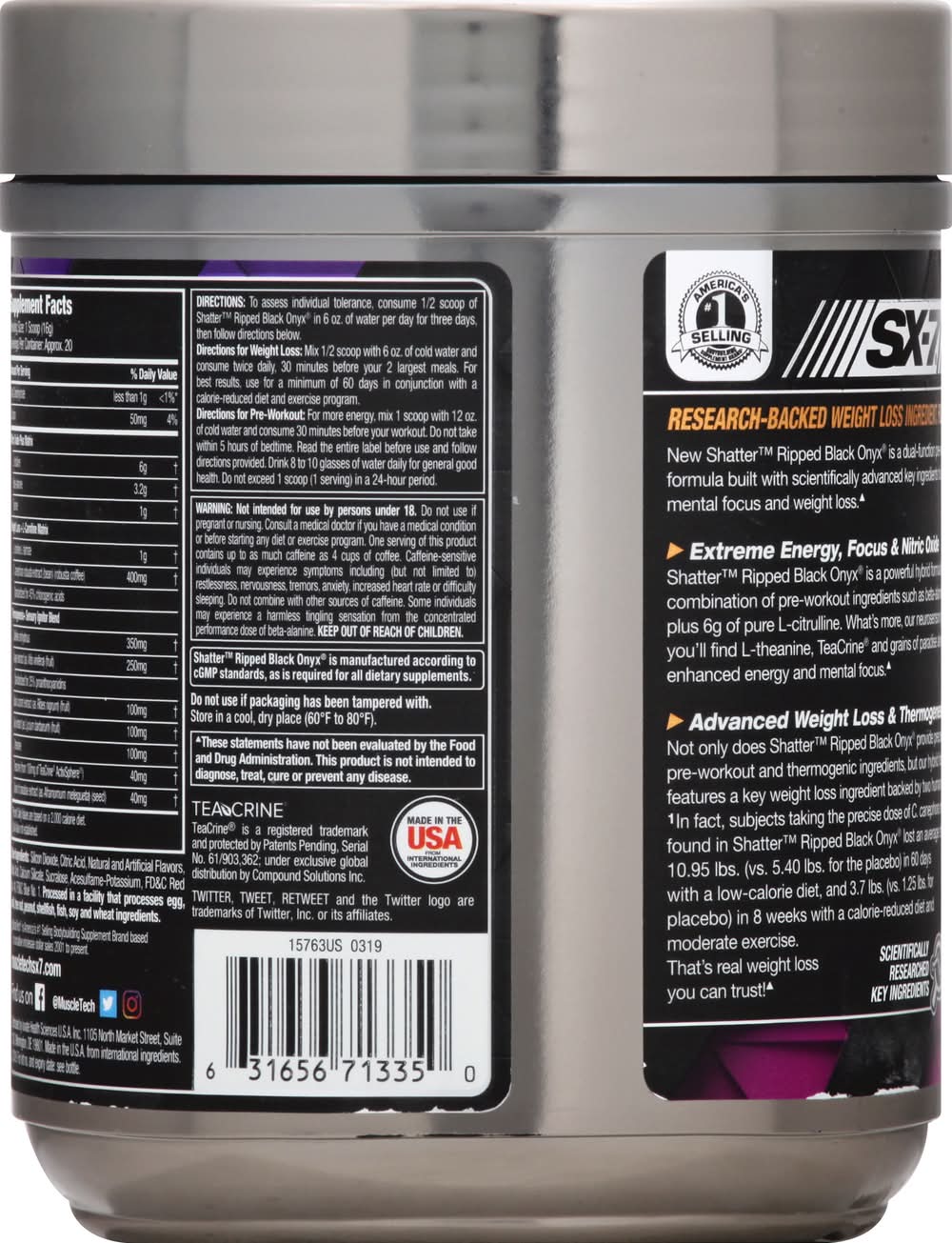 Directions for use: Usage of instructions:To assess individual tolerance, consume 1/2 scoop of Shatter Ripped Black Onyx in 6 oz. of water per day for three days, then follow directions below. Directions for Weight Loss: Mix 1/2 scoop with 6 oz. of cold water and consume twice daily, 30 minutes before your 2 largest meals. For best results, use for a minimum of 60 days in conjunction with a calorie-reduced diet and exercise program. Directions for Pre-Workout: For more energy, mix 1 scoop with 12 oz. of cold water and consume 30 minutes before your workout. Do not take within 5 hours of bedtime. Read the entire label before use and follow directions provided. Drink 8 to 10 glasses of water daily for general good health. Do not exceed 1 scoop (1 serving) in a 24-hour period. - Directions: To assess individual tolerance, consume 1/2 scoop of Shatter Ripped Black Onyx in 6 oz. of water per day for three days, then follow directions below. Directions for Weight Loss: Mix 1/2 scoop with 6 oz. of cold water and consume twice daily, 30 minutes before your 2 largest meals. For best results, use for a minimum of 60 days in conjunction with a calorie-reduced diet and exercise program. Directions for Pre-Workout: For more energy, mix 1 scoop with 12 oz. of cold water and consume 30 minutes before your workout. Do not take within 5 hours of bedtime. Read the entire label before use and follow directions provided. Drink 8 to 10 glasses of water daily for general good health. Do not exceed 1 scoop (1 serving) in a 24-hour period. Store in a cool, dry place (60 degrees F to 80 degrees F). Storage recommendation: Store in a cool, dry place (60 degrees F to 80 degrees F).