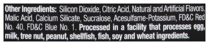 Nitric Oxide Plus Matrix: L-Citrulline, Beta-Alanine, Taurine. Weight Loss + L- Carnitine Matrix: L-Carnitine L-Tartrate, C. Canephora Robusta Extract (Bean) (Robusta Coffee) Standardized for 45% Chlorogenic Acids. Thermogenesis + Sensory Ignitor Blend: Caffeine Anhydrous, Grape Extract (as Vitis Vinifera) (Fruit) Standardized for 25% Proanthocyanidins, Black Currant Extract (as Ribes Nigrum) (Fruit), Goji Extract (as Lycium Barbarun) (Fruit), L-Theanine, Theacrine (from 100 mg of Teacrine ActivSphere), Grains of Paradise Extract (as Aframomum Melegueta) (Seed). Other Ingredients: Silicon Dioxide, Citric Acid, Natural and Artificial Flavors, Malic Acid, Calcium Silicate, Sucralose, Acesulfame-Potassium, FD&C Red 40, FD&C Blue 1 Contains: None Additives: None