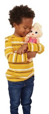 Whipping up a pink treat for baby is so much FUN with Magical Mixer Baby doll’s real working toy blender! Just open 1 of the 2 included powdered doll food packets (additional powdered doll food sold separately), pour it in the blender with 3 tsp. (15 ml.) of water, and press down on the button to mix up baby’s food! This doll also comes with a spoon for feeding, and a comb for brushing her pretty blonde hair. She drinks, wets, and “poops,” too! After baby’s finished her food, give her a few sips of water from her bottle. Uh-oh! It’s time to change baby’s diaper! It’s a great toy or gift for girls and boys ages 3 years old and up. Baby Alive and all related properties are trademarks of Hasbro. • Includes doll with removable outfit, 2 diapers, 2 packets of doll food, blender, bottle, spoon, comb, and instructions. • For ages 3+ • WARNING: Small parts may be generated. • Note: Adult should remove and discard fasteners/packaging components. • Doll food not intended to be eaten. • Included powdered doll food is NOT reusable and is intended for use ONLY with Baby Alive dolls that take powdered doll food. • Baby Alive powdered doll food may stain some surfaces. Adult supervision recommended. • DIAPER FILLING: ALL NEW MATERIALS: SOFTWOOD PULP. • SURFACE CLEAN ONLY