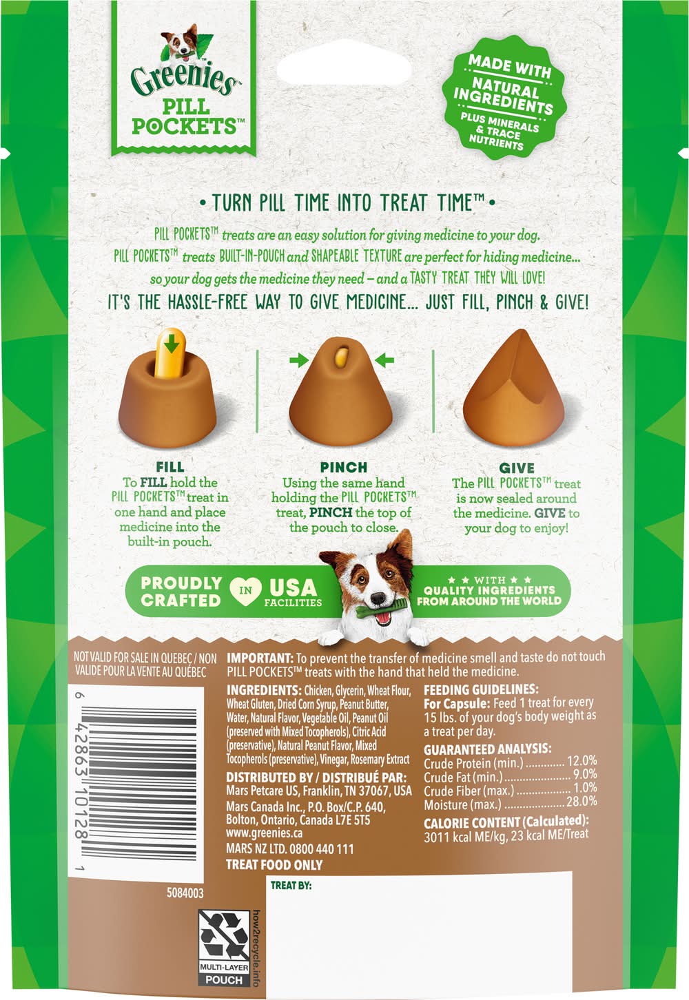 Turn pill time into treat time! Greenies Pill Pockets Treats are the #1 veterinarian-recommended choice for giving pills, based on a survey of US Veterinarians. Why hide your pet's medicine in human foods like peanut butter or cheese when you can give them a dog treat made with natural ingredients plus minerals and trace nutrients? Greenies Pill Pockets Real Peanut Butter Flavor Dog Treats are made with real peanut butter and take the hassle out of giving your canine companion medicine. Whether for large breeds or small dogs, these large-sized capsule Pill Pockets make taking medicine a positive experience for your dog. And they're easy to give: Drop a capsule into the large Pill Pocket dog treat, pinch the top to close, give it to your dog, and watch their medicine disappear. Greenies Pill Pockets dog treats are the easy way to give your dog their meds-and they'll never know the difference. • Size: 0.64 lb • Mars Petcare Us, Franklin, TN, 37067