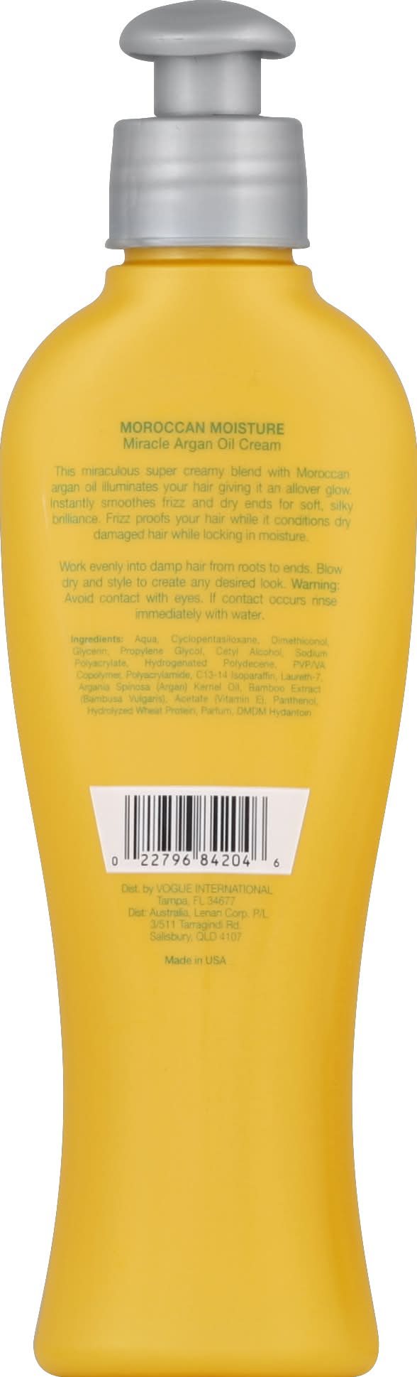 Smoothes. Deeply moisturizes. Softens & fuses split ends. This miraculous super creamy blend with Moroccan argan oil illuminates your hair giving it an allover glow. Instantly smoothes frizz and dry ends for soft, silky brilliance. Frizz proofs your hair while it conditions dry damaged hair while locking in moisture. Made in USA. VOGUE INTERNATIONAL,