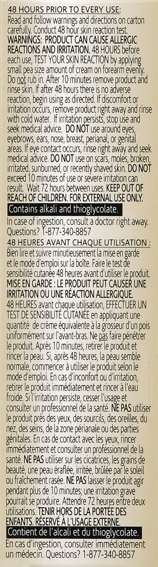 48 Hours Prior to Every Use: Read and follow warnings and directions on carton carefully. Conduct 48-hour skin reaction test. 1. Prepare Your Skin: Apply Skin Guarding Balm: First, lightly apply the Skin Guarding Balm across the middle of the areas you wish to treat. Be sure the layer is thin, and apply it only once for effective hair removal. Massage Skin Guarding Balm: Use your fingers to massage the balm into your skin, going beyond the area you wish to treat. Massage for 20 seconds in a circular motion. This ensures there is a pre-treatment layer to keep the hair removal cream from coming in direct contact with your skin, and that hairs aren't overly coated. 2. Remove the Hair: Apply Hair Removal Cream: Apply a layer of Hair Removal Cream to your fingertip (small grape size for upper lip treatment) and immediately smooth over the area to be treated. Cover it completely with a thick layer. Do not rub it in. Use only with the Skin Guarding Balm provided. Wash hands immediately and thoroughly. Let process for 6-8 minutes. Leave on longer for thicker hair, but do not exceed 10 minutes. Remove Hair/Cream: After 6-8 minutes, gently remove cream with a tissue or cotton ball. Rinse your skin thoroughly with lukewarm water and pat dry.