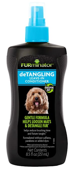 Need help avoiding the dreaded shave down at the groomer Keep your doodle looking dandy and help loosen mats, detangle fur and refresh their coat with FURminator deTangling Leave-In Conditioner This formula's moisturizing and conditioning ingredients help to reduce brushing time and future tangles while its gentle ingredients keep your pup's coat and skin moisturized. OdorCapture 360 technology helps neutralize tough pet odors. You can feel good about using a leave-in conditioner spray formulated without sulfates, parabens or added dyes. Lightly scented, the formula is also enriched with aloe vera, keratin and vitamin E. Plus, it's safe for pets and pH balanced for both dogs and puppies. This product is formulated and packaged in the USA, and the bottle is made with 25% post-consumer recycled material. When used and stored as directed. When used frequently as part of a good grooming routine. Must be 6 weeks and older. Size: 0.65 lb
