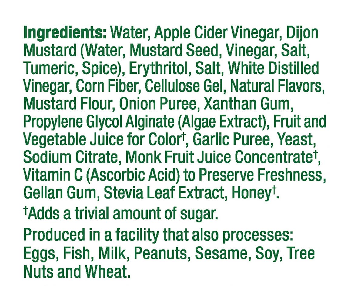 Water, Apple Cider Vinegar, Dijon Mustard (Water, Mustard Seed, Vinegar, Salt, Tumeric, Spice), Erythritol, Salt, White Distilled Vinegar, Corn Fiber, Cellulose Gel, Natural Flavors, Mustard Flour, Onion Puree, Xanthan Gum, Propylene Glycol Alginate (Algae Extract), Fruit and Vegetable Juice for Color (a), Garlic Puree, Yeast, Sodium Citrate, Monk Fruit Juice Concentrate (a), Vitamin C (Ascorbic Acid) to Preserve Freshness Gellan Gum, Stevia Leaf Extract, Honey (a). (a) Adds a Trivial Amount of Sugar Contains: None Additives: None