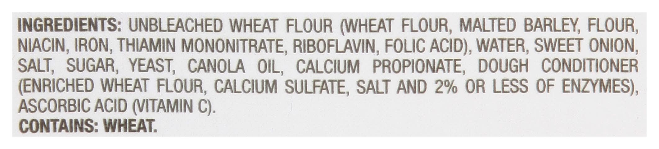 Unbleached Wheat Flour (Wheat Flour, Malted Barley, Flour, Niacin, Iron, Thiamin Mononitrate, Riboflavin, Folic Acid), Water, Sweet Onion, Salt, Sugar, Yeast, Canola Oil, Calcium Propionate, Dough Conditioner (Enriched Wheat Flour, Calcium Sulfate, Salt and 2% or Less of Enzymes), Ascorbic Acid (Vitamin C) Contains: Wheat, Barley