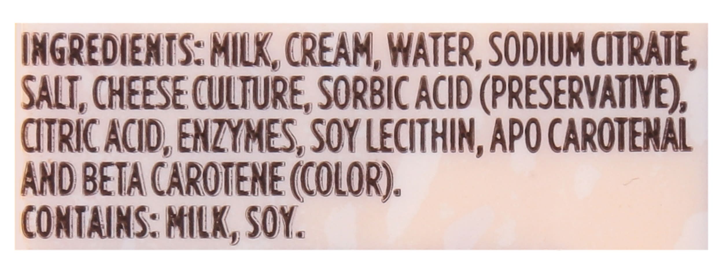 Milk, Cream, Water, Sodium Citrate, Salt, Cheese Culture, Sorbic Acid (Preservative), Citric Acid, Enzymes, Soy Lecithin, Apo Carotenal and Beta Carotene (Color) Contains: Milk, Soybeans