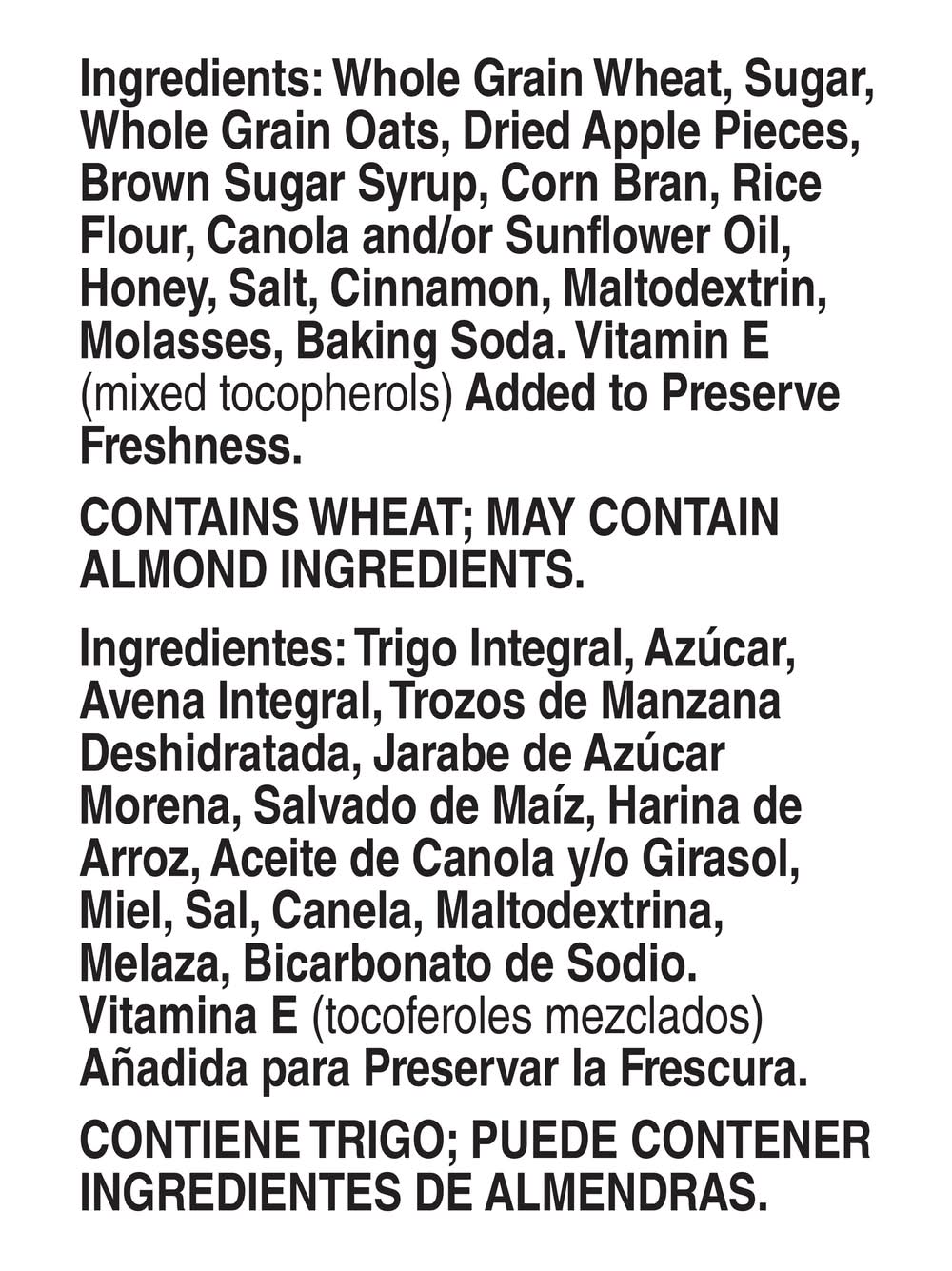 Ingredients: Whole Grain Wheat, Sugar, Whole Grain Oats, Dried Apple Pieces, Brown Sugar Syrup, Corn Bran, Rice Flour, Canola and/or Sunflower Oil, Honey, Salt, Cinnamon, Maltodextrin, Molasses, Baking Soda, Vitamin E (Mixed Tocopherols) Added to Preserve Freshness. Contains: Wheat, Oat, Tree Nuts, Almonds