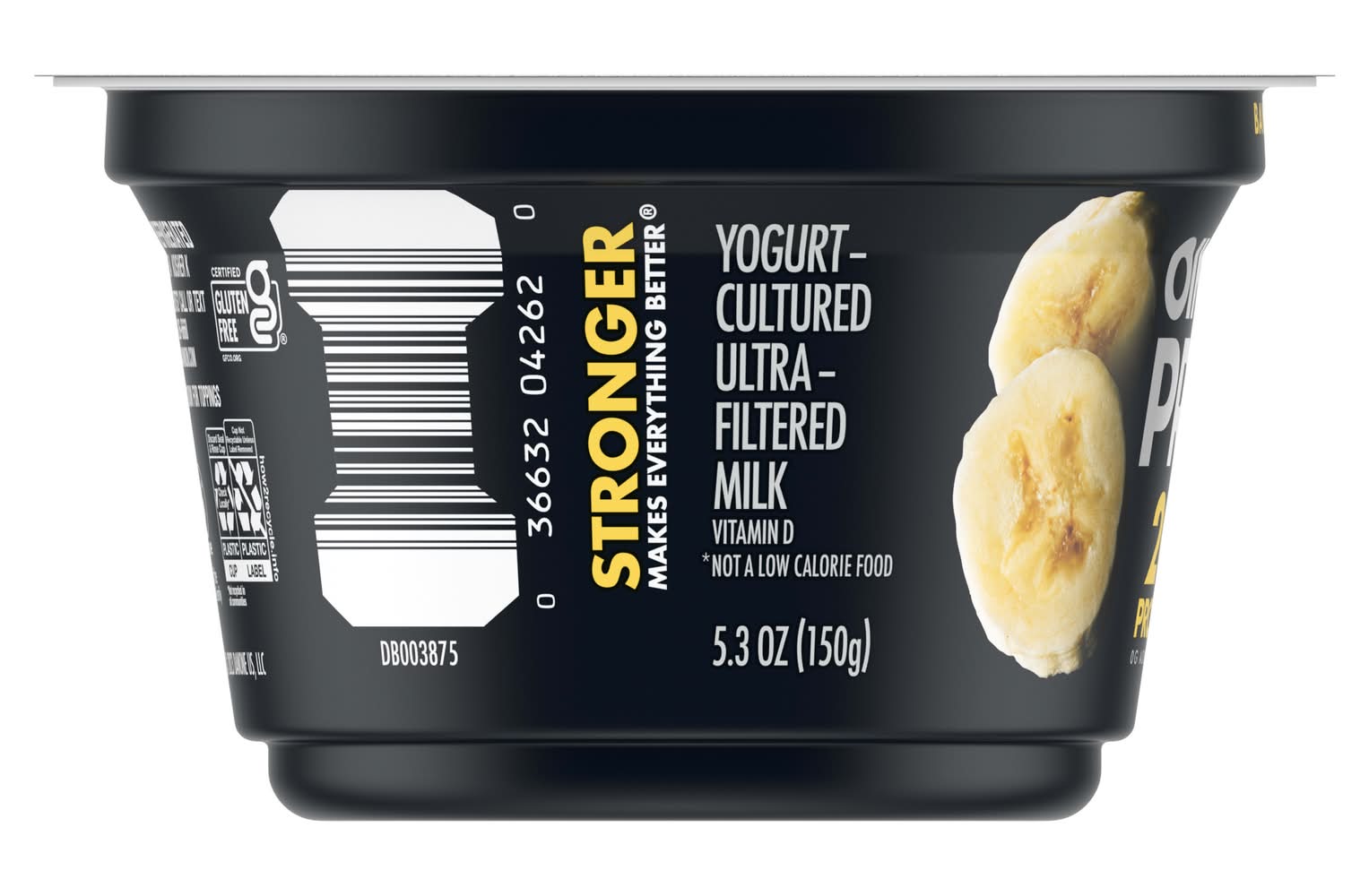 Go Pro with Oikos Pro Banana Yogurt-Cultured Ultra-Filtered Milk Product, the spoonable high protein snack with more of what you want, and less of what you don’t. Every serving contains 0g added sugar* and nine essential amino acids, in addition to vitamin D and calcium for strong bones. Each Oikos Pro snack cup packs a punch with 20g of protein per serving, so you can always have dependable, high protein snacks to help you add more protein to your day. Because when you feel strong, you are unstoppable. With protein and deliciousness, these snacks for adults can help you strive to reach your potential with every serving. Protein is important - an essential nutrient that we need in our diet - and Oikos Pro cups are great tasting, convenient solutions for adding complete protein every day. Pack a banana snack cup for days that start at a sprint and enjoy a delicious boost of protein at lunch. Each snack cup leaves room for toppings, so throw in your favorite fruit for an extra refreshing snack. Need 0g added sugar,* 0 artificial sweeteners, and 0% fat? Try Oikos Triple Zero with 15g of protein per serving. Want the creamy one with the fruit pieces? Oikos Blended has you covered. Oikos — Stronger Makes Everything Better (R). *Not a low-calorie food.
