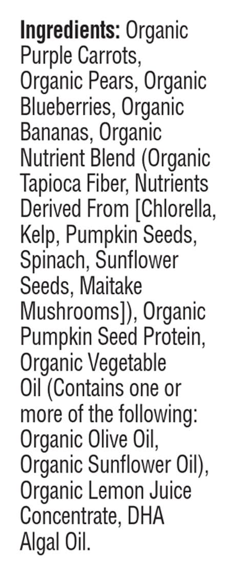 Organic Purple Carrots, Organic Pears, Organic Blueberries, Organic Bananas, Organic Nutrient Blend (Organic Tapioca Fiber, Nutrients Derived from [Chlorella, Kelp, Pumpkin Seeds, Spinach, Sunflower Seeds, Maitake Mushrooms]), Organic Pumpkin Seed Protein, Organic Vegetable Oil (Contains One or More of the Following: Organic Olive Oil, Organic Sunflower Oil), Organic Lemon Juice Concentrate, DHA Algal Oil