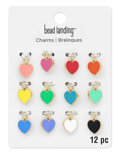 This fun set of charms from Bead Landing will add a playful touch to your accessory creations. With an assortment of enameled hearts in bright hues, these charms are great on their own used to fill out a chain bracelet or paired with complimentary stones and beads to make cute dangly earrings. Includes assorted colors. 14.3mm x 9.8mm charm size. 12 charms. Zinc alloy and resin
