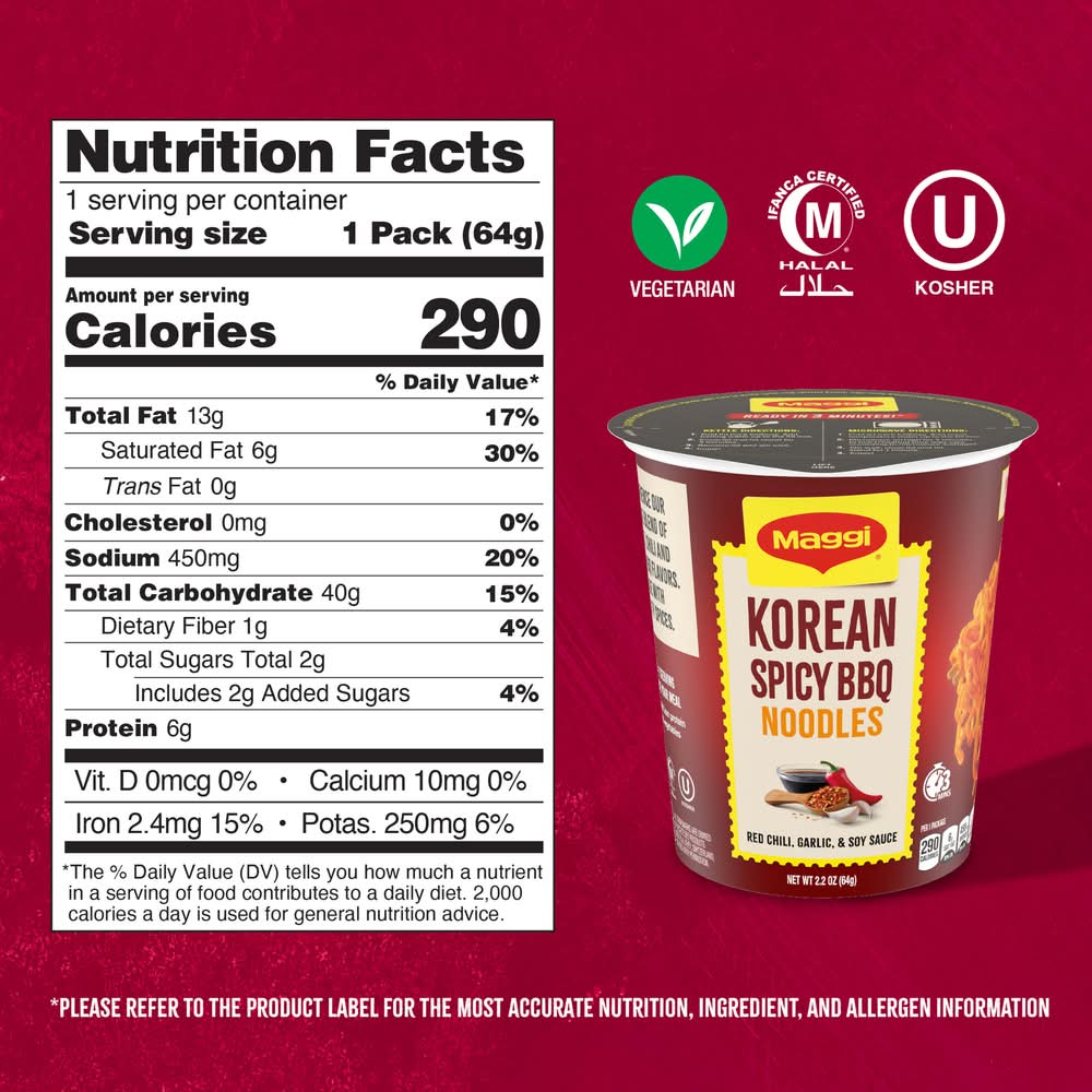 Explore global cuisine, no passport required. With Maggi Noodles, you have access to a world of bold and savory flavors, whenever you want it. Our Korean Spicy BBQ Noodles aren't your average instant noodles. With Maggi Noodles you'll experience the rich and vibrant flavors of Korean style cuisine. These Korean style noodles have a delicious blend of red chili, garlic and soy sauce – keeping the perfect balance of flavor and spice in every bite. Our savory cup of noodles offer the perfect base to add your own ingredients and experiment with flavors! Ready within minutes, you'll be enjoying your hot Korean BBQ ramen noodles in no time! Nestle USA Production - ProductXM,