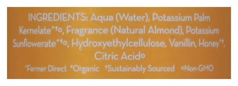 Aqua (Water), Potassium Palm Kernelate (Farmer Direct) (Sustainably Sourced) (Non-GMO), Fragrance (Natural Almond), Potassium Sunflowerate (Farmer Direct) (Sustainably Sourced) (Non-GMO), Hydroxyethylcellulose, Vanillin, Honey (Farmer Direct) (Sustainably Sourced) Citric Acid (Non-GMO) Contains: Tree Nuts, Almonds Additives: None