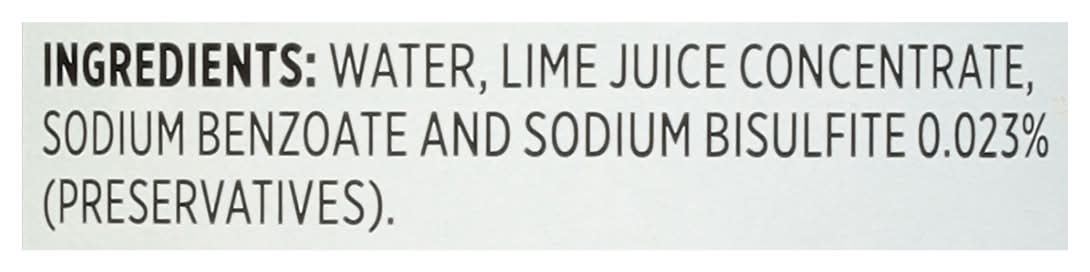 Water, Lime Juice Concentrate, Sodium Benzoate and Sodium Bisulfite 0, 023% (Preservatives) Contains: Sulfites