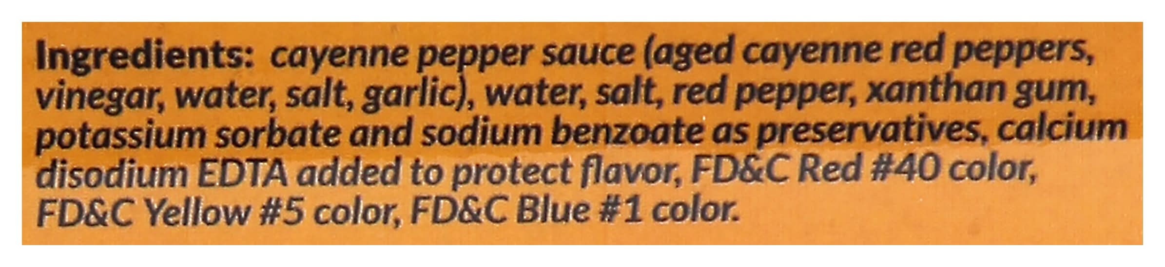 Cayenne Pepper Sauce (Aged Cayenne Red Peppers, Vinegar, Water, Salt, Garlic), Water, Salt, Red Pepper, Xanthan Gum, Potassium Sorbate and Sodium Benzoate as Preservatives, Calcium Disodium EDTA Added to Protect Flavor, FD&C Red 40 Color, FD&C Yellow 5 Color, FD&C Blue 1 Color