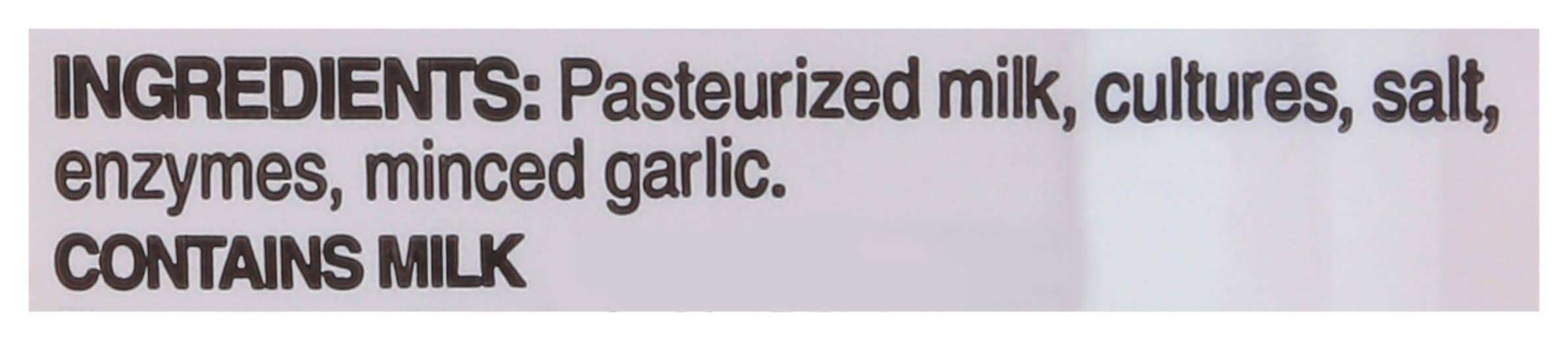 Pasteurized Milk, Cultures, Salt, Enzymes, Minced Garlic Contains: Milk