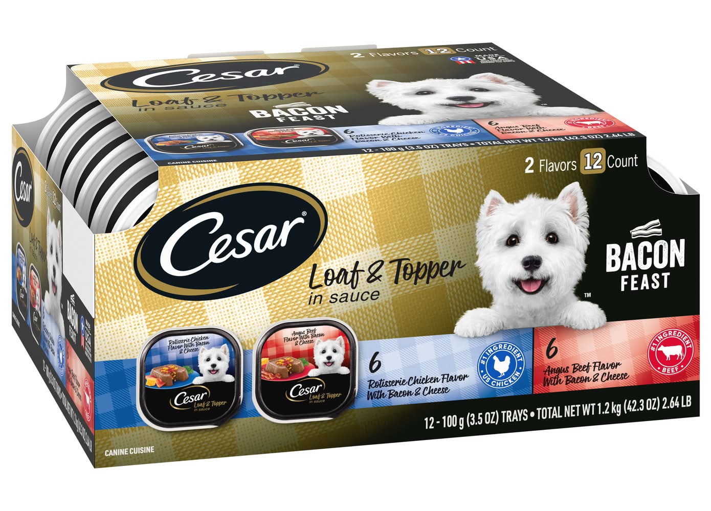 6 Rotisserie Chicken Flavor with Bacon & Cheese; 6 Angus Beef Flavor with Bacon & Cheese. 2 Flavors. 12 Count. Cesar Canine Cuisine is Guaranteed to tempt even the fussiest eater. If not satisfied or to learn more call 1-800-525-5273 or visit cesar.com. cesar.com. Made in the USA with the finest ingredients from around the world. • Pack size: 12 • Size: 12 CT