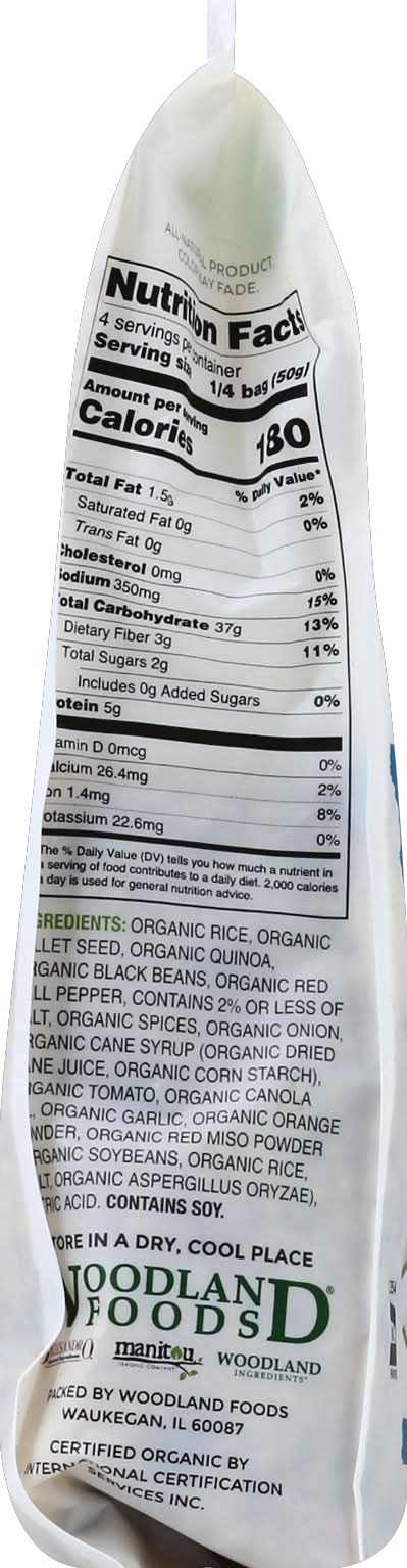 Organic Rice, Organic Millet Seed, Organic Quinoa, Organic Black Beans, Organic Red Bell Pepper, Contains 2% or Less of Salt, Organic Spices, Organic Onion, Organic Cane Syrup (Organic Dried Cane Juice, Organic Corn Starch), Organic Tomato, Organic Canola Oil, Organic Garlic, Organic Orange Powder, Organic Red Miso Powder (Organic Soybeans, Organic Rice, Salt, Organic Aspergillus Oryzae), Citric Acid Contains: Soybeans