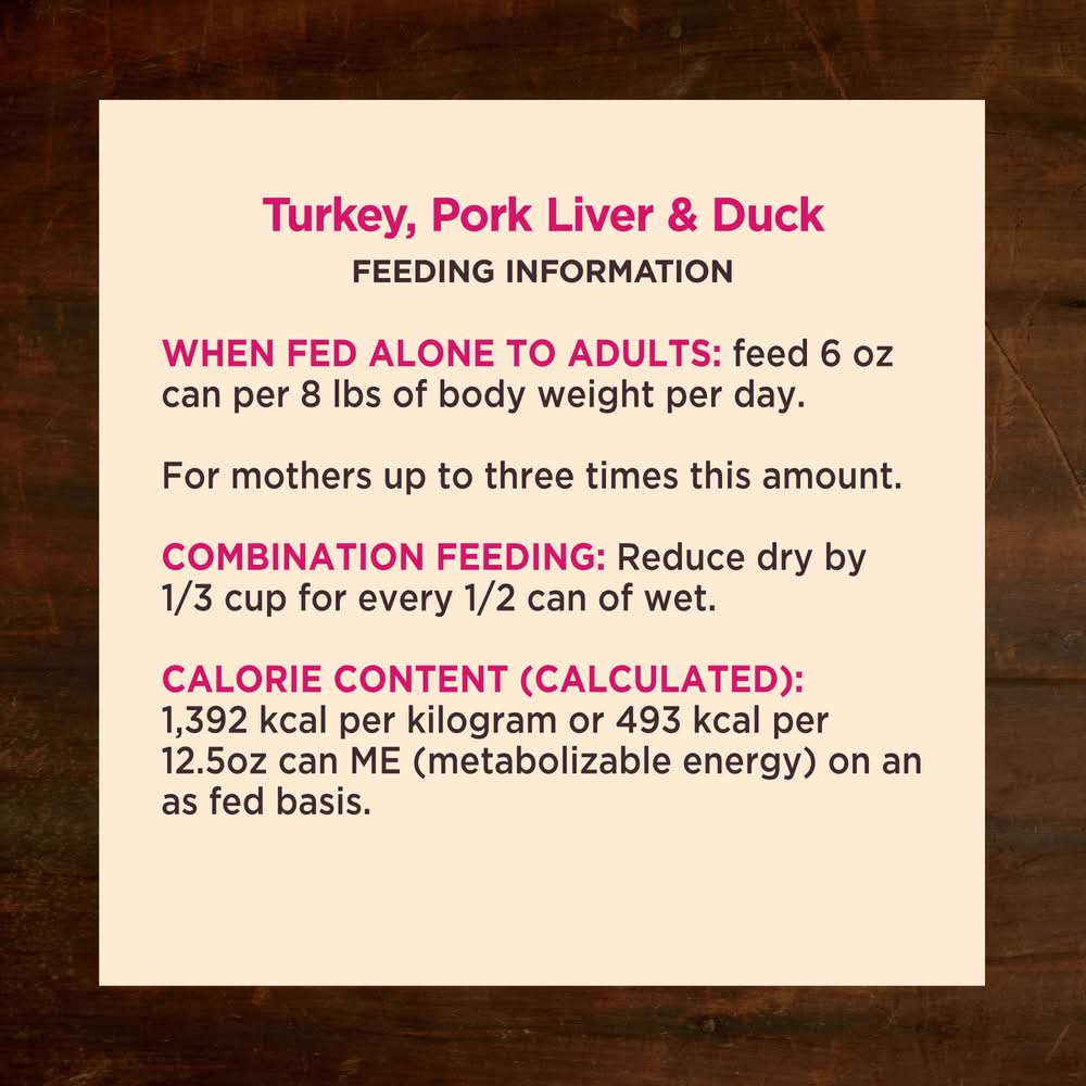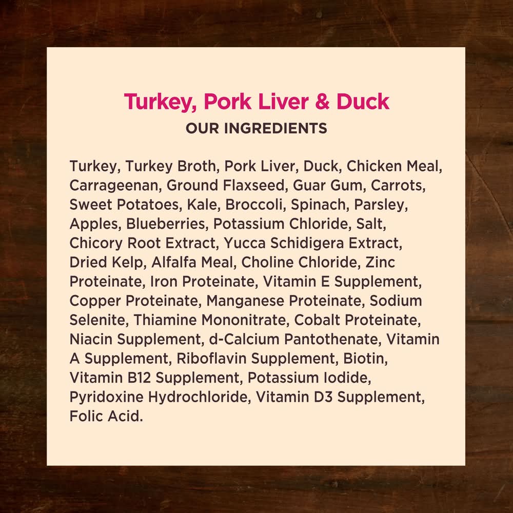 Turkey, Turkey Broth, Pork Liver, Duck, Chicken Meal, Ground Flaxseed, Carrageenan, Guar Gum, Carrots, Sweet Potatoes, Kale, Broccoli, Spinach, Parsley, Apples, Blueberries, Salt, Potassium Chloride, Chicory Root Extract, Yucca Schidigera Extract, Dried Kelp, Alfalfa Meal, Choline Chloride, Zinc Proteinate, Iron Proteinate, Vitamin E Supplement, Copper Proteinate, Manganese Proteinate, Sodium Selenite, Thiamine Mononitrate, Cobalt Proteinate, Niacin Supplement, d-Calcium Pantothenate, Vitamin A Supplement, Riboflavin Supplement, Biotin, Vitamin B12 Supplement, Potassium Iodide, Pyridoxine Hydrochloride, Vitamin D3 Supplement, Folic Acid. Contains: Soy Free ; Wheat Free