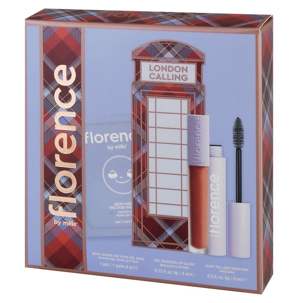 Bow under the eyes gel pads 1 pair (4 g e); Get glossed lip gloss 0.13 fl. oz. lid. 4 ml e; built to lash mascara 0.3 fl. oz. liq. 9 ml e. PETA: Vegan See you there, mate! The London Calling set lets us answer yes please! to all our holiday party invites with an easy-peasy festive look. This set includes a limited-edition rose gold shape to Get Glossed Lip Gloss and our Built to Lash Mascara, plus a pair of limited-edition bow-shaped under eye gel pads to help late-night eyes feel refreshed. Mills favorite childhood memories always pop up as soon as she spots a red telephone box! We keep it clean. For all skin types. florencebymills.com. We support youth living life to the fullest. For more information visit florencebymills.com. FSC: Mix - Paper. Get Glossed Lip Gloss: Made in USA. Built to Lash Mascara: Made in Italy. Bow Under Eye Gel Pads: Made in South Korea. Florence Beauty, LLC,