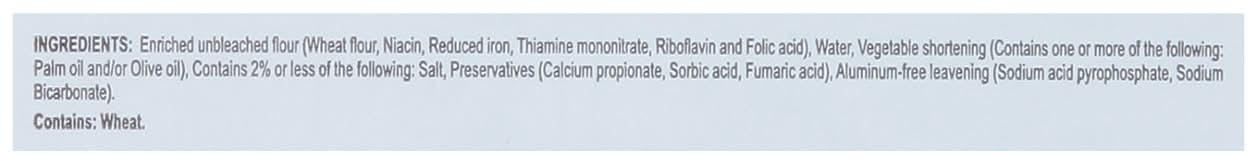Enriched Unbleached Flour (Wheat Flour, Niacin, Reduced Iron, Thiamine Mononitrate, Riboflavin and Folic Acid), Water, Vegetable Shortening (Contains One or More of the Following: Palm Oil and/or Olive Oil), Contains 2% or Less of the Following: Salt, Preservatives (Calcium Propionate, Sorbic Acid, Fumaric Acid), Aluminum-Free Leavening (Sodium Acid Pyrophosphate, Sodium Bicarbonate) Contains: Wheat