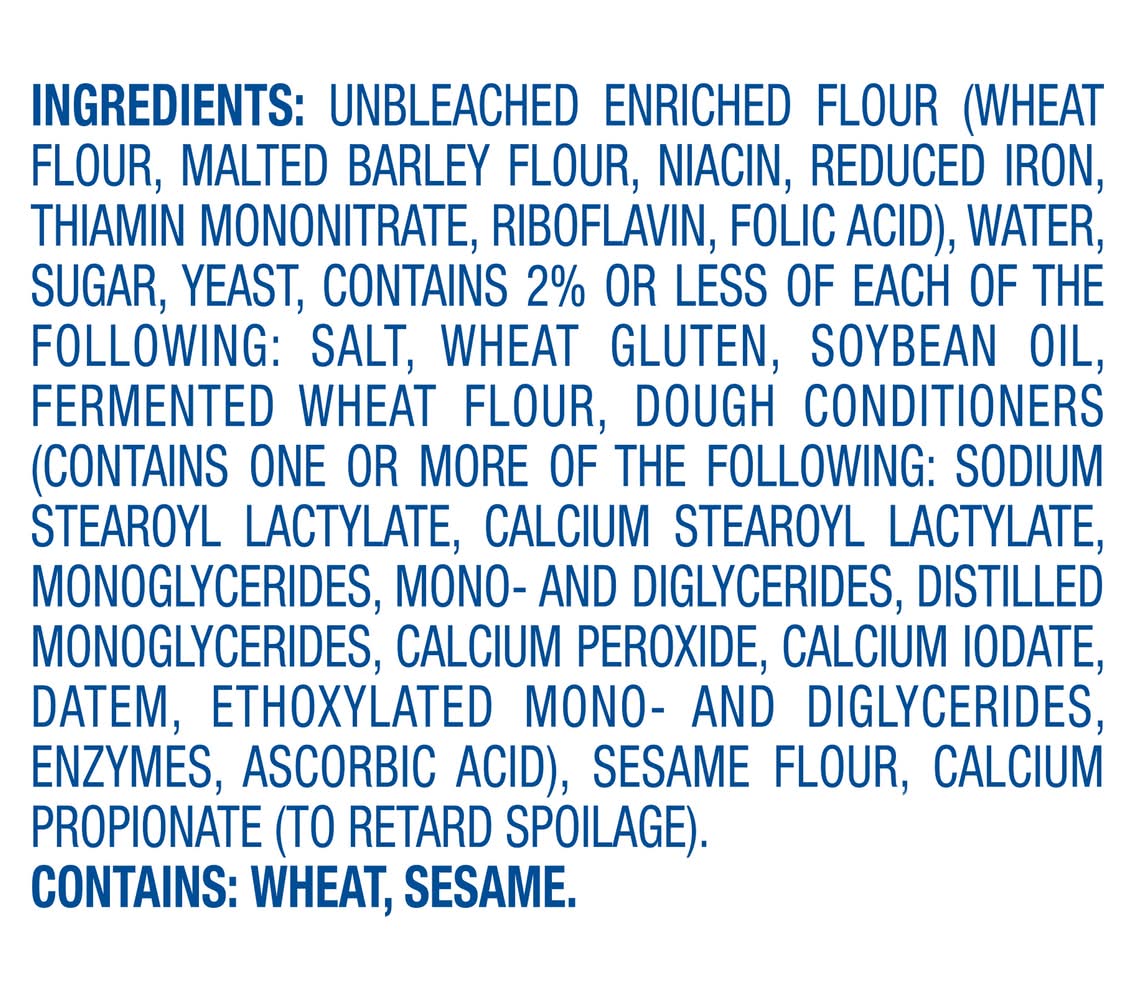 Unbleached Enriched Flour (Wheat Flour, Malted Barley Flour, Niacin, Reduced Iron, Thiamin Mononitrate, Riboflavin, Folic Acid), Water, Sugar, Yeast, Contains 2% or Less of Each of the Following: Salt, Wheat Gluten, Soybean Oil, Fermented Wheat Flour, Dough Conditioners (Contains One or More of the Following: Sodium Stearoyl Lactylate, Calcium Stearoyl Lactylate, Monoglycerides, Mono- and Diglycerides, Distilled Monoglycerides, Calcium Peroxide, Calcium Iodate, DATEM, Ethoxylated Mono- and Diglycerides, Enzymes, Ascorbic Acid), Sesame Flour, Calcium Propionate (to Retard Spoilage) Contains: Wheat, Sesame, Barley, Gluten, Soybeans
