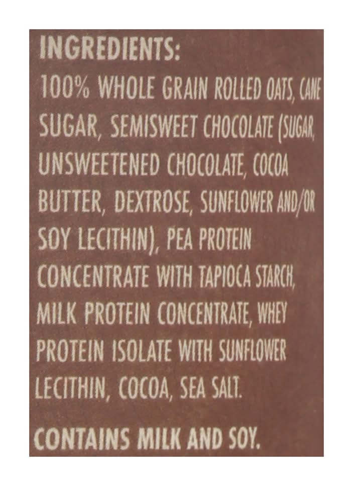 Ingredients: 100% Whole Grain Rolled Oats, Cane Sugar, Semisweet Chocolate (Sugar, Unsweetened Chocolate, Cocoa Butter, Dextrose, Sunflower and/or Soy Lecithin), Pea Protein Concentrate with Tapioca Starch, Milk Protein Concentrate, Whey Protein Isolate with Sunflower Lecithin, Cocoa, Sea Salt Contains: Milk, Soybeans, Oat, Eggs, Tree Nuts, Wheat