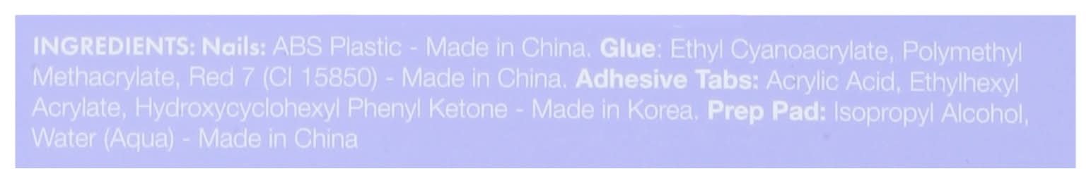 Nails: ABS Plastic- Made in China, Glue: Ethyl Cyanoacrylate, Polymethyl Methacrylate, Red 7 (CI 15850) - Made in China, Adhesive Tabs: Acrylic Acid, Ethylhexyl Acrylate, Hydroxycyclohexyl Phenyl Ketone - Made in Korea, Prep Pad: Isopropyl Alcohol, Water (Aqua) - Made in China