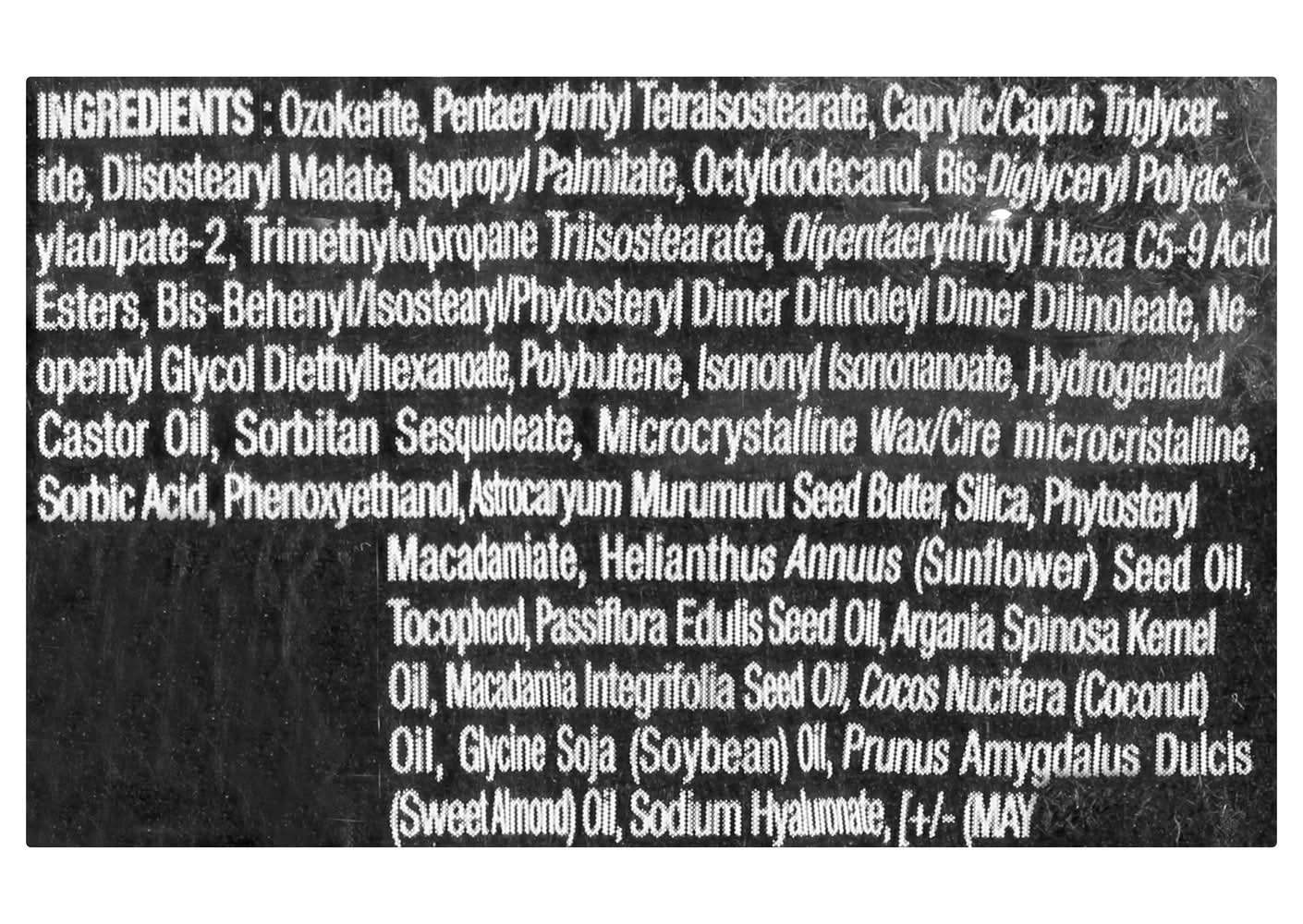 Ozokerite, Tater, Pentaerythrityl Tetraisostearate, Caprylic Capric Triglyceride, Diisostearyl Malate, Isopropyl Palmitate, Octyldodecanol, Bis-Diglycdryl Polyacyladipate-2, Trimethylolpropane Triisostearate, Dipentaerythrirtyl, Hexa C5-9 Acid Esters, Bis-Behenyi/Isostearyl/Phytosteryl Dimer Dilinoleyl Dimer Dilinoleate, Ne-Opentyl Glycol Diettylhexanote, Polybutene, Isononyl Isononanoate, Hydrogenated Castor Oil, Sorbitan Sesquioleate, Microcrystalline Wax/Cire Microcristalline, Sorbic Acid, Phenoxyethanol Astrocaryum Murumuru Seed Butter Silica, Phytosteryl Macdamiate, Helianthus Annuus (Sunflower) Seed Oil, Tocopherol, Passiflora Edulis Seed Oil, Argania Spinosa Kernel Oil, Macadamia Integrifolia Seed Oil, Cocos Nucifera (Coconut) Oil, Glycine Soja (Soybean) Oil, Prunus Amygdalus Dulcis (Sweet Almond) Oil, Prunus Amygdalus Dulcis (Sweet Almond) Oil, Sodium Hyalumonate, [+/- (May Contain) : Mica, Iron Oxides/CI 77491, CI 77492, CI 77499, Titanium Dioxide/CI 77891, Blue 1 Lake/CI 42090, Red 28 Lake/CI 77891, Blue 1 Lake/CI 42090, Red 28 Lake/CI 45410, Red 7 Lake/CI 15850], [1901-1] Contains: Soybeans, Tree Nuts