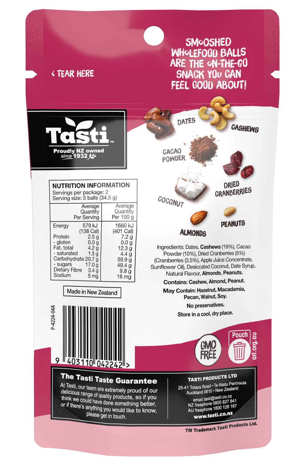 Tasti Berry Cashew & Cacao Smooshed Wholefood Balls (69g, 6 pack)
