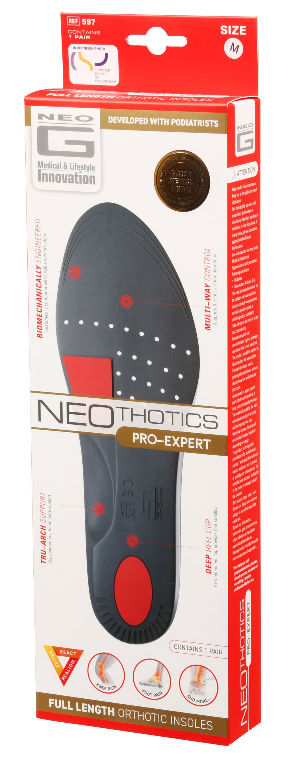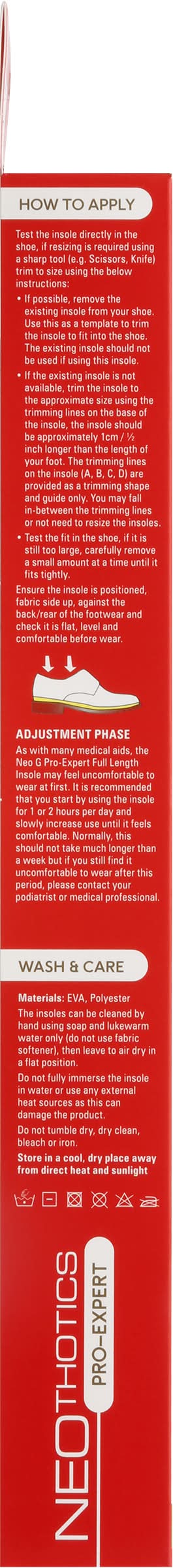 Directions for use: Usage of instructions:How to apply: Test the insole directly in the shoe, if resizing is required using a sharp tool (e.g. Scissors, Knife) trim to size using the below instructions: If possible, remove the existing insole from your shoe. Use this as a template to trim the insole to fit into the shoe. The existing insole should not be used if using this insole. If the existing insole is not available, trim the insole to the approximate size using the trimming lines on the base of the insole, the insole should be approximately 1cm/½ inch longer than the length of your foot. The trimming lines on the insole (A, B, C, D) are provided as a trimming shape and guide only. You may fall in-between the trimming lines or not need to resize the insoles. Test the fit in the shoe, if it is still too large, carefully remove a small amount at a time until it fits tightly. Ensure the insole is positioned, fabric side up, against the back/rear of the footwear and check it is flat, level and comfortable before wear. Adjustment phase: As with many medical aids, the Neo G Pro-Expert Full Length Insole may feel uncomfortable to wear at first. It is recommended that you start by using the insole for 1 or 2 hours per day and slowly increase use until it feels comfortable. Normally, this should not take much longer than a week but if you still find it uncomfortable to wear after this period, please contact your podiatrist or medical professional. Features: Developed in conjunction with leading podiatrists to provide biomechanical support where it is needed. Multi-Way Motion Control can help to correct posture and alignment. Deep Heel Cup provides stability and comfort. Tru-Arch for flat feet, fallen arches and best alignment. Dual Density Cushioning for the heel and 1st metatarsal head. Trim to Fit Anatomical Design, for versatile everyday use in a variety of footwear (For footwear with prominent orthotics/insoles already present, recommend consulting a medical professional before use.). Helps: The conditions the insoles can assist with include: Heel pain; Arch pain; Ankle instability; Achilles tendonitis; Knee pain; Back pain; Plantar fasciitis; Morton's Neuroma; Hallux Limitus; Flat Feet; The indications outlined may not be suitable for your condition. Always consult your podiatrist or medical professional to confirm product suitability. How it works: React: Nerve endings in the foot send signals to the brain as they react to the insole. Realign: Muscles in the feet and legs begin to adapt to the insole, realigning the body. Relief: As the body begins to realign, underlying problems are eased helping to reduce pain. Sizing: Sizing is based on standard shoe sizes. If measurement is on the border, a larger size is recommended. US (M): 3 - 6; 6.5 - 9; 9.5 - 12. US (F): 4.5 - 7.5; 8 - 10.5; 11 - 13.5. UK: 2.5 - 5.5; 6 - 8.5; 9 - 11.5. EU: 35 - 38; 39 - 41; 42 - 46. Size: S; M; L. - Directions: How to apply: Test the insole directly in the shoe, if resizing is required using a sharp tool (e.g. Scissors, Knife) trim to size using the below instructions: If possible, remove the existing insole from your shoe. Use this as a template to trim the insole to fit into the shoe. The existing insole should not be used if using this insole. If the existing insole is not available, trim the insole to the approximate size using the trimming lines on the base of the insole, the insole should be approximately 1cm/½ inch longer than the length of your foot. The trimming lines on the insole (A, B, C, D) are provided as a trimming shape and guide only. You may fall in-between the trimming lines or not need to resize the insoles. Test the fit in the shoe, if it is still too large, carefully remove a small amount at a time until it fits tightly. Ensure the insole is positioned, fabric side up, against the back/rear of the footwear and check it is flat, level and comfortable before wear. Adjustment phase: As with many medical aids, the Neo G Pro-Expert Full Length Insole may feel uncomfortable to wear at first. It is recommended that you start by using the insole for 1 or 2 hours per day and slowly increase use until it feels comfortable. Normally, this should not take much longer than a week but if you still find it uncomfortable to wear after this period, please contact your podiatrist or medical professional. Features: Developed in conjunction with leading podiatrists to provide biomechanical support where it is needed. Multi-Way Motion Control can help to correct posture and alignment. Deep Heel Cup provides stability and comfort. Tru-Arch for flat feet, fallen arches and best alignment. Dual Density Cushioning for the heel and 1st metatarsal head. Trim to Fit Anatomical Design, for versatile everyday use in a variety of footwear (For footwear with prominent orthotics/insoles already present, recommend consulting a medical professional before use.). Helps: The conditions the insoles can assist with include: Heel pain; Arch pain; Ankle instability; Achilles tendonitis; Knee pain; Back pain; Plantar fasciitis; Morton's Neuroma; Hallux Limitus; Flat Feet; The indications outlined may not be suitable for your condition. Always consult your podiatrist or medical professional to confirm product suitability. How it works: React: Nerve endings in the foot send signals to the brain as they react to the insole. Realign: Muscles in the feet and legs begin to adapt to the insole, realigning the body. Relief: As the body begins to realign, underlying problems are eased helping to reduce pain. Sizing: Sizing is based on standard shoe sizes. If measurement is on the border, a larger size is recommended. US (M): 3 - 6; 6.5 - 9; 9.5 - 12. US (F): 4.5 - 7.5; 8 - 10.5; 11 - 13.5. UK: 2.5 - 5.5; 6 - 8.5; 9 - 11.5. EU: 35 - 38; 39 - 41; 42 - 46. Size: S; M; L. Store in a cool, dry place away from direct heat and sunlight Wash & care: The insoles can be cleaned by hand using soap and lukewarm water only (do not use fabric softener