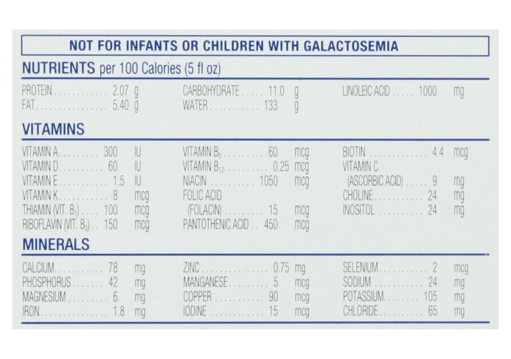 Water, Nonfat Milk, Lactose, High Oleic Safflower Oil, Soy Oil, Coconut Oil, Whey Protein Concentrate; Less than 0.5% of: (Cohnii Oil is a Source of DHA, M, Alpina Oil is a Source of ARA), Cohnii Oil, M, Alpina Oil, (Fucosyllactose (2-Fl); a Periodic Like That Found in Breast Milk)-Fucosyllactose, Short-Chan Fructooligosaccharides, Beta-Carotene, Lutein, Ascorbic Acid, Soy Lecithin, Monoglycerides, Potassium Citrate, Calcium Carbonate, Potassium Chloride, Carrageenan, Ferrous Sulfate, Magnesium Chloride, Choline Chloride, Choline Bitartrate, Taurine, Inositol, Calcium Phosphate, Zinc Sulfate, Potassium Phosphate, D-Alpha-Tocopheryl Acetate, Niacinamide, Calcium Pantothenate, L-Carnitine, Vitamin A Palmitate, Copper Sulfate, Thiamin Hydrochloride, Riboflavin, Pyridoxine Hydrochloride, Folic Acid, Manganese Sulfate, Phylloquinone, Biotin, Sodium Selenate, Vitamin D3, Vitamin B12, Salt, Potassium Iodide, Potassium Hydroxide, and Nucleotides (Adenosine 5'-Monophosphate, Cytidine 5'-Monophosphate, Disodium Guanosine 5'-Monophosphate, Disodium Uridine 5'-Monophosphate) Contains: Milk, Soybeans, Lactose, Tree Nuts Additives: None