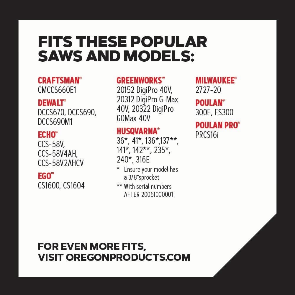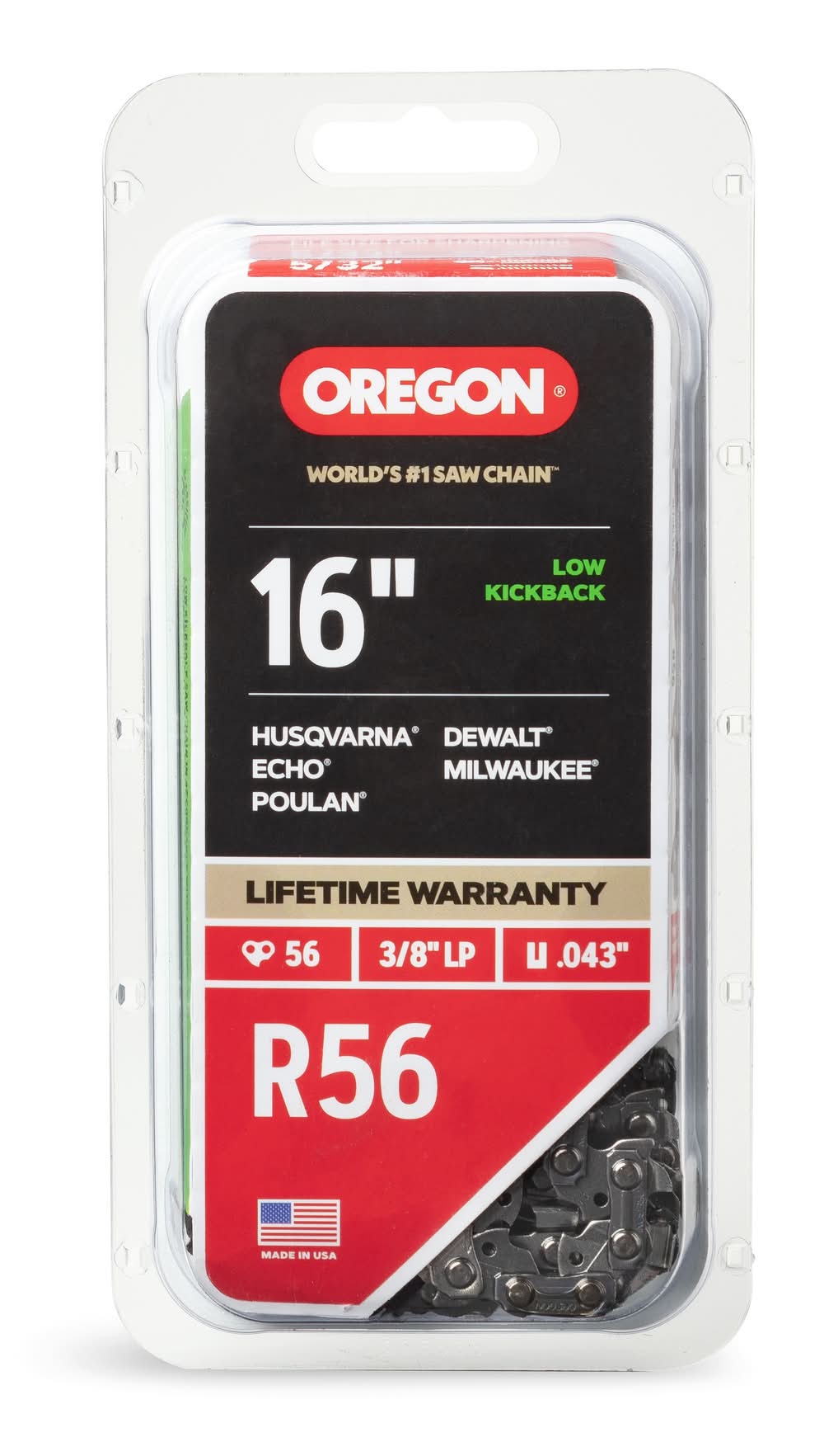 The Oregon R56 AdvanceCut Saw Chain offers higher chain efficiency making it an ideal choice for landscapers and homeowners who use small, low powered saws. The 0.043 in. gauge narrow kerf cutting systems increase efficiency since they need less power from the saw than standard cutting systems. This 16 in., 3/8 in. pitch chain fits saws from This product can expose you to chemicals including Nickel, which is known to the State of California to cause cancer. For more information go to www.P65Warnings.ca.gov Size: 16 in