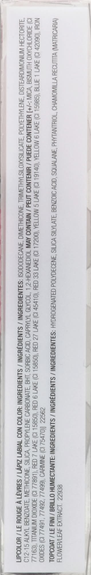 Ingredients: Lipcolor: Isododecane, Dimethicone, Trimethylsiloxysilicate, Polyethylene, Disteardimonium Hectorite, C12-15 Alkyl Benzoate, Methicone, Silica, Propylene Carbonate, BHT, Sorbic Acid, Caprylyl Glycol, 1, 2 Hexanediol, May Contain [+/-: Mica, Bismuth Oxychloride (CI 771631, Titanium Dioxide (CI 77891), Red 7 Lake (CI 15850), Red 6 Lake (CI 15850), Red 27 Lake (CI 45410), Red 33 Lake (CI 17200), Yellow 5 Lake (CI 19140), Yellow 6 Lake (CI 15985), Blue 1 Lake (CI 42090), Iron Oxides (CI 77491, 77492, 77499), Carmine (CI 75470). Topcoat: Hydrogenated Polydecene, Silica Silylate, Benzoic Acid, Squalane, Phytantriol, Chamomilla Recutita (Matricaria) Flower/Leaf Extract