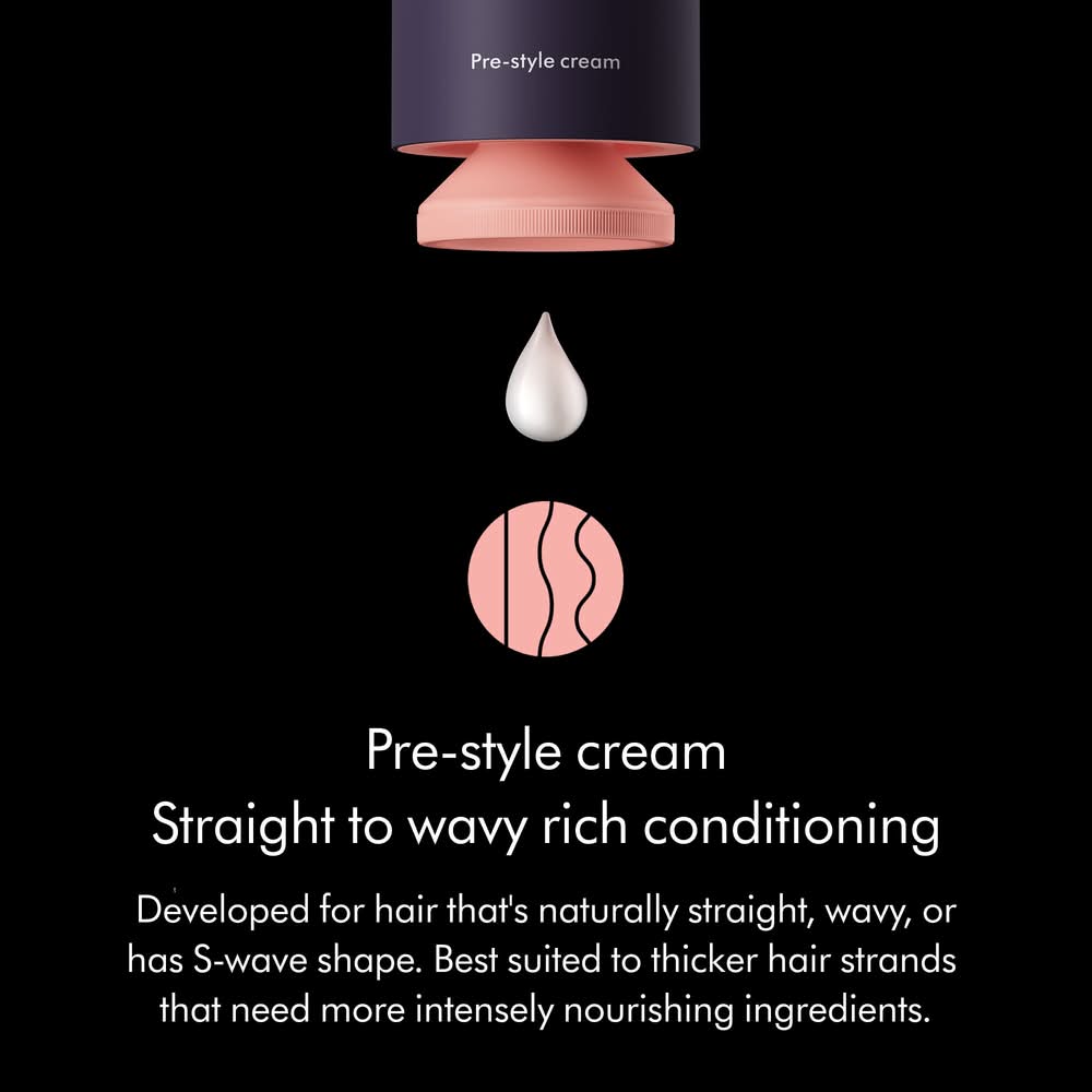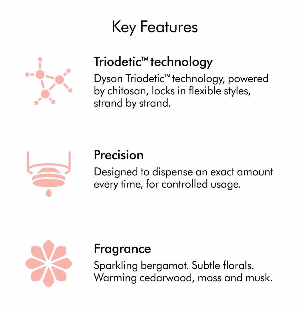 Available in four formulas, each precisely blended with ingredients to deliver the best results for your specific hair type. Hair Texture Straight, Wavy, Curly, and Coily. Hair Type Fine, Medium, and Thick, Hair Concerns Hold & Style Extending Shine. Key Benefits Provides 2X longer hold. Without the crunch. Up to 50% less frizz. Conditions the hair surface. Highlighted Ingredients Chitosan Locks in flexible hold. Argan Oil Reduces frizz. Grapeseed Oil Seals in shine. Dyson uses chitosan derived from oyster mushrooms, not shellfish in our styling range. Mushroom derived chitosan offers a sustainable and non-allergenic solution for our active ingredient. -Ingredient Callouts Free of parabens, formaldehydes, formaldehyde-releasing agents, phthalates, mineral oil, retinyl palmitate, oxybenzone, coal tar, hydroquinone, sulfates SLS & SLES, triclocarban, and triclosan. What Else You Need to Know Conventional retention products create a glue like bond between strands, leaving hair feeling crunchy. In response, Dyson has developed a lightweight retention product that conditions each individual hair while locking in your style.
