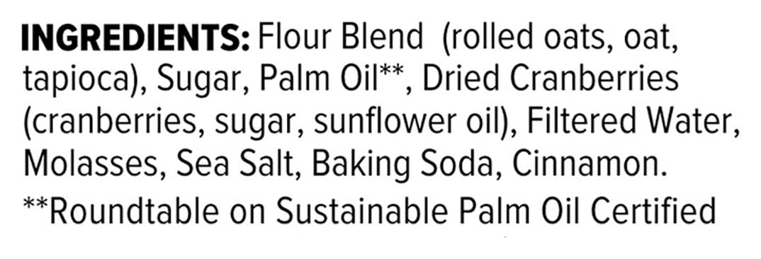 Flour Blend (Rolled Oats, Oat, Tapioca), Sugar, Palm Oil (Roundtable on Sustainable Palm Oil Certified), Dried Cranberries (Cranberries, Sugar, Sunflower Oil), Filtered Water, Molasses, Sea Salt, Baking Soda, Cinnamon Contains: Oat