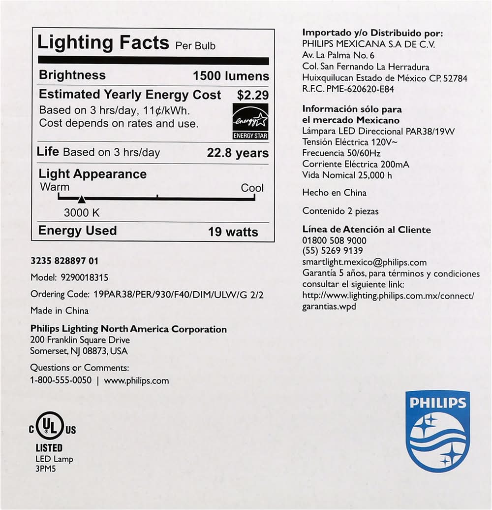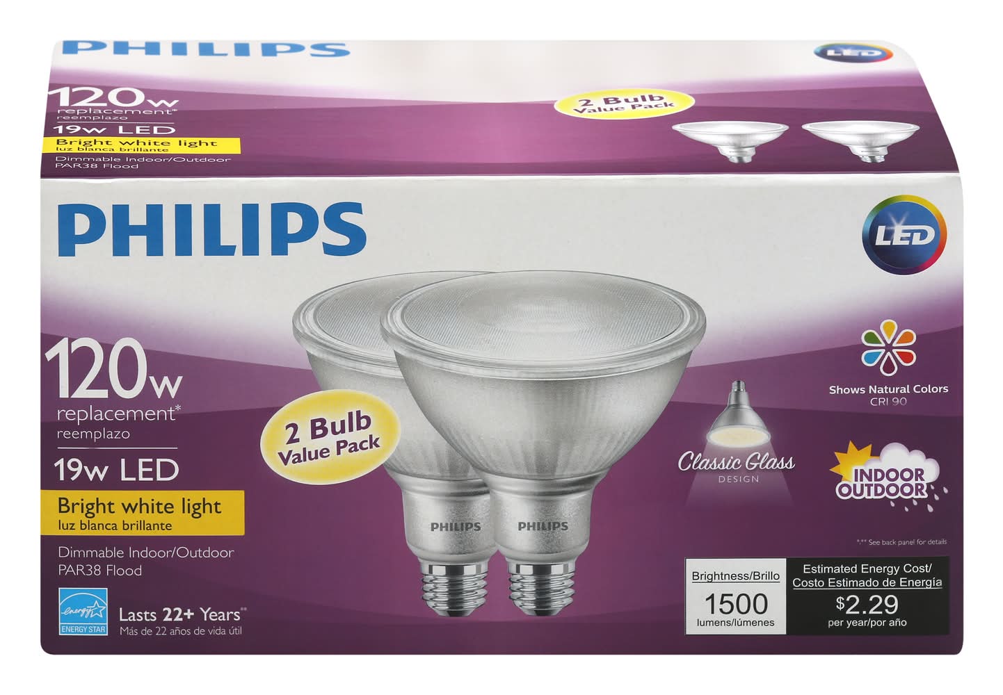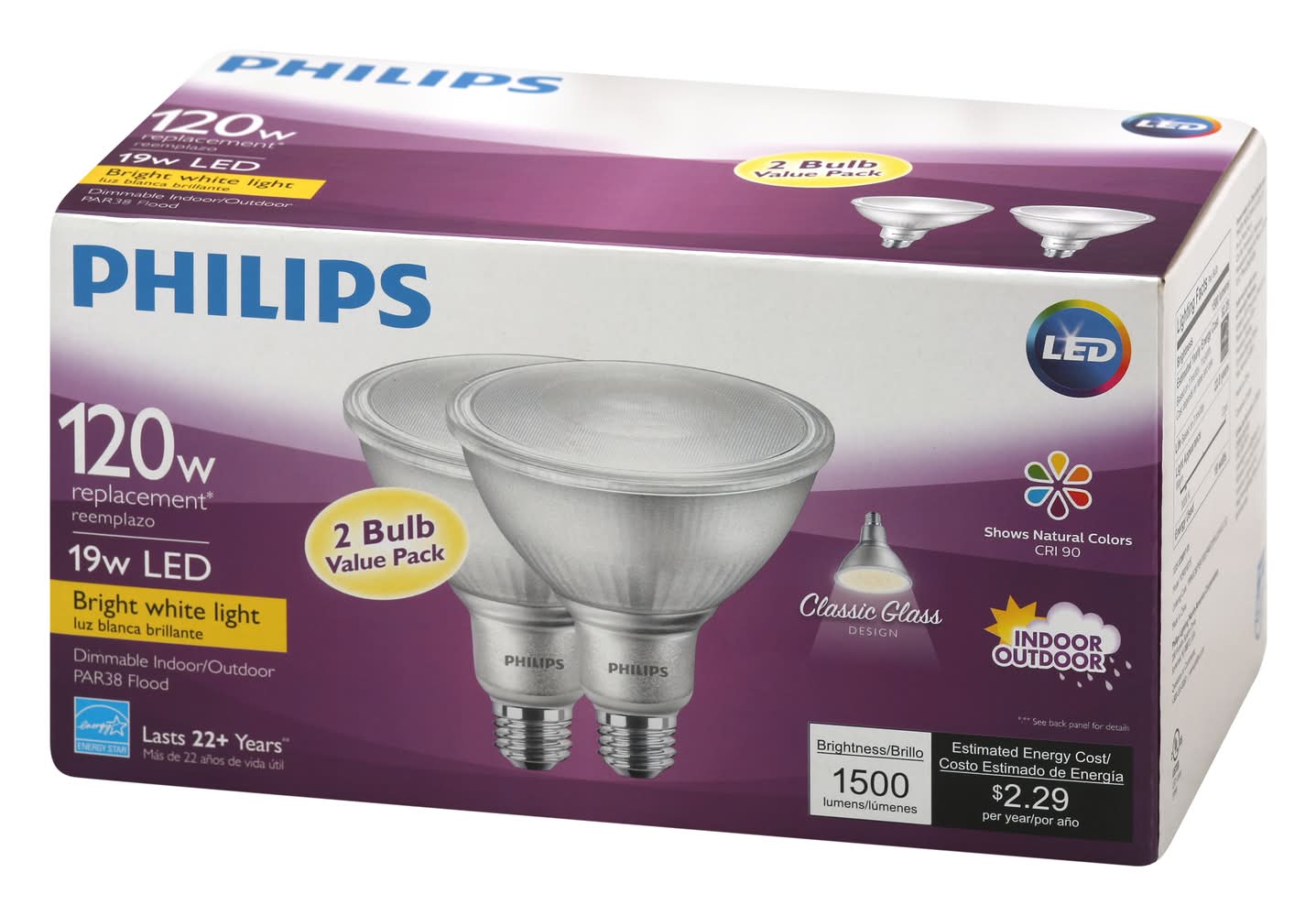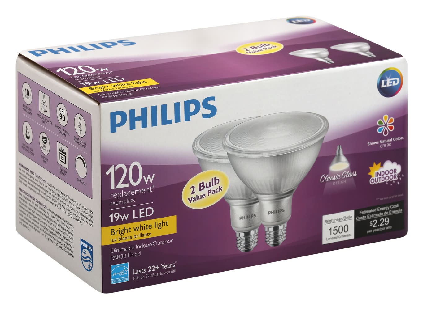 Light Bulbs, LED, Bright White Light, 19 Watts, 2 Bulb Value Pack Philips Lighting North America C, Somerset, NJ, 08873