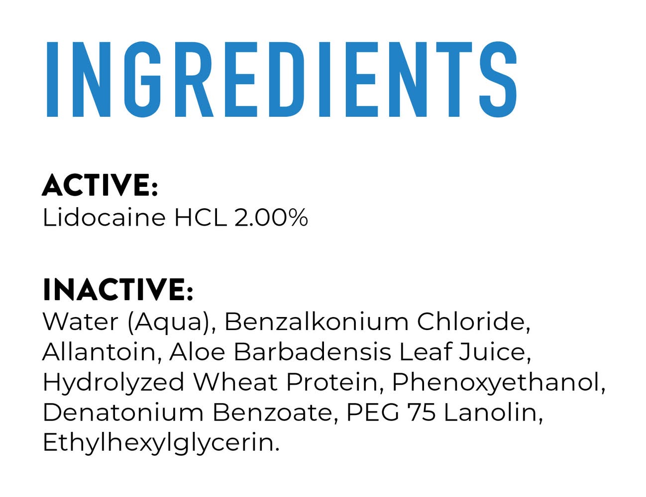 Active Ingredients: Purpose Lidocaine HCL 2.00%...............................................................................Pain Relief, Numbing, Itch Relief Inactive Ingredients: Water (Aqua), Benzalkonium Chloride, Allantoin, Aloe Barbadensis Leaf Juice, Hydrolyzed Wheat Protein, Phenoxyethanol, Denatonium Benzoate, PEG 75 Lanolin, Ethylhexylglycerin.