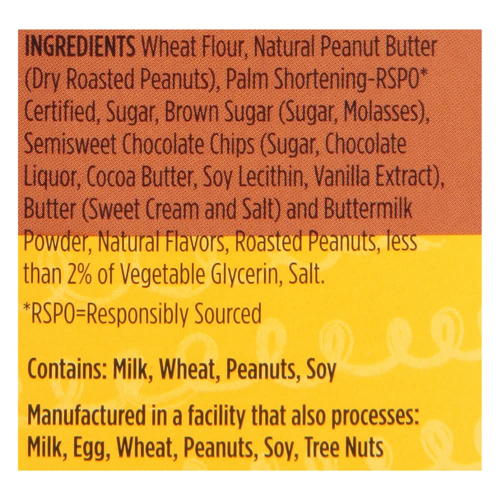 Wheat Flour, Natural Peanut Butter (Dry Roasted Peanuts), Palm Shortening-RSPO (RSPO=Responsibly Sourced) Certified, Sugar, Brown Sugar (Sugar, Molasses), Semisweet Chocolate Chips (Sugar, Chocolate Liquor, Cocoa Butter, Soy Lecithin, Vanilla Extract), Butter (Sweet Cream and Salt) and Buttermilk Powder, Natural Flavors, Roasted Peanuts, Less than 2% of Vegetable Glycerin, Salt Contains: Milk, Wheat, Peanuts, Soybeans, Eggs, Tree Nuts