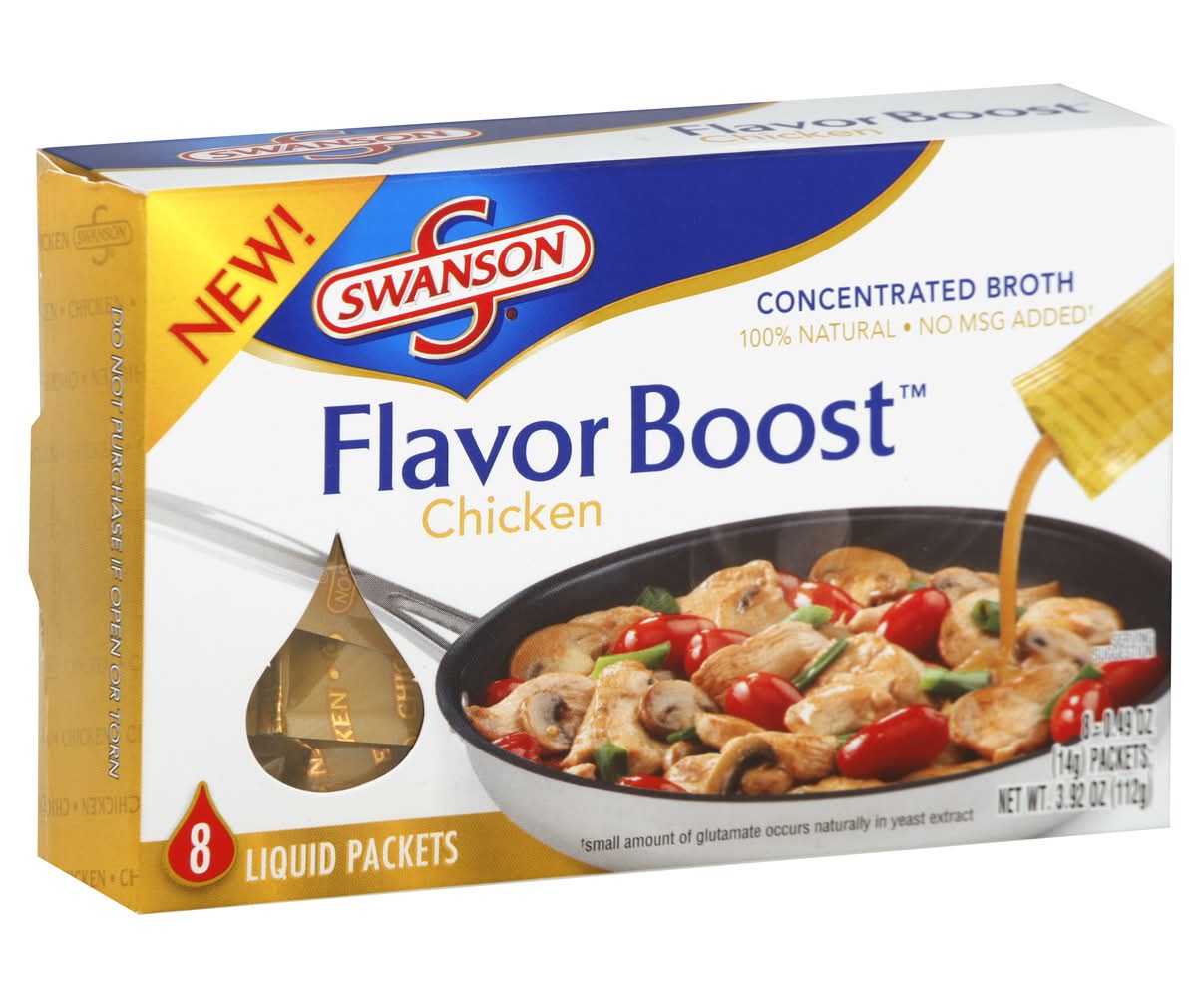Use 1 or 2 liquid packets of Swanson Flavor Boost concentrated broth to flavor a pound of boneless chicken or ground turkey. 1 packet can make 1 cup broth. Recommend use by date on package. Promptly refrigerate leftovers.
