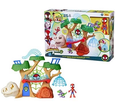Imagine swinging into dino-chomping action and adventure with the Marvel Spidey and His Amazing Friends Dino-Webs Treehouse! This girls & boys action figure playset features a platform trap, dino fossil cave, collapsing web bridge, falling web cage, and more! The Dino-Webs Treehouse also comes with a 4-inch-scale (10cm) Spidey action figure and a 2.5-inch (6cm) Goblin Raptor toy, so preschool kids ages 3 and up can race into action to help Team Spidey take down the baddies! Inspired by the Marvel preschool show, kids will love hanging with their favorite Marvel Super Heroes and recreating epic adventures. Encourage big, imaginative adventure play for kids with more Spidey and his Amazing Friends toys! (Each sold separately. Subject to availability.) Copyright MARVEL. All trademarks and registered trademarks are the property of their respective owners. HASBRO and all related trademarks and logos are trademarks of Hasbro, Inc. Includes: 2 figures and playset. Ages 3 and up. WARNING: CHOKING HAZARD – Small parts may be generated. Not for children under 3 years. Adult assembly required.