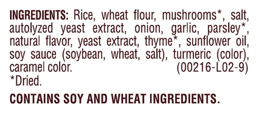 Ingredients: Rice, Wheat Flour, Mushrooms (Dried), Salt, Autolyzed Yeast Extract, Onion, Garlic, Parsley (Dried), Natural Flavor, Yeast Extract, Thyme (Dried), Sunflower Oil, Soy Sauce (Soybean, Wheat, Salt), Turmeric (Color), Caramel Color. Contains: Soybeans, Wheat