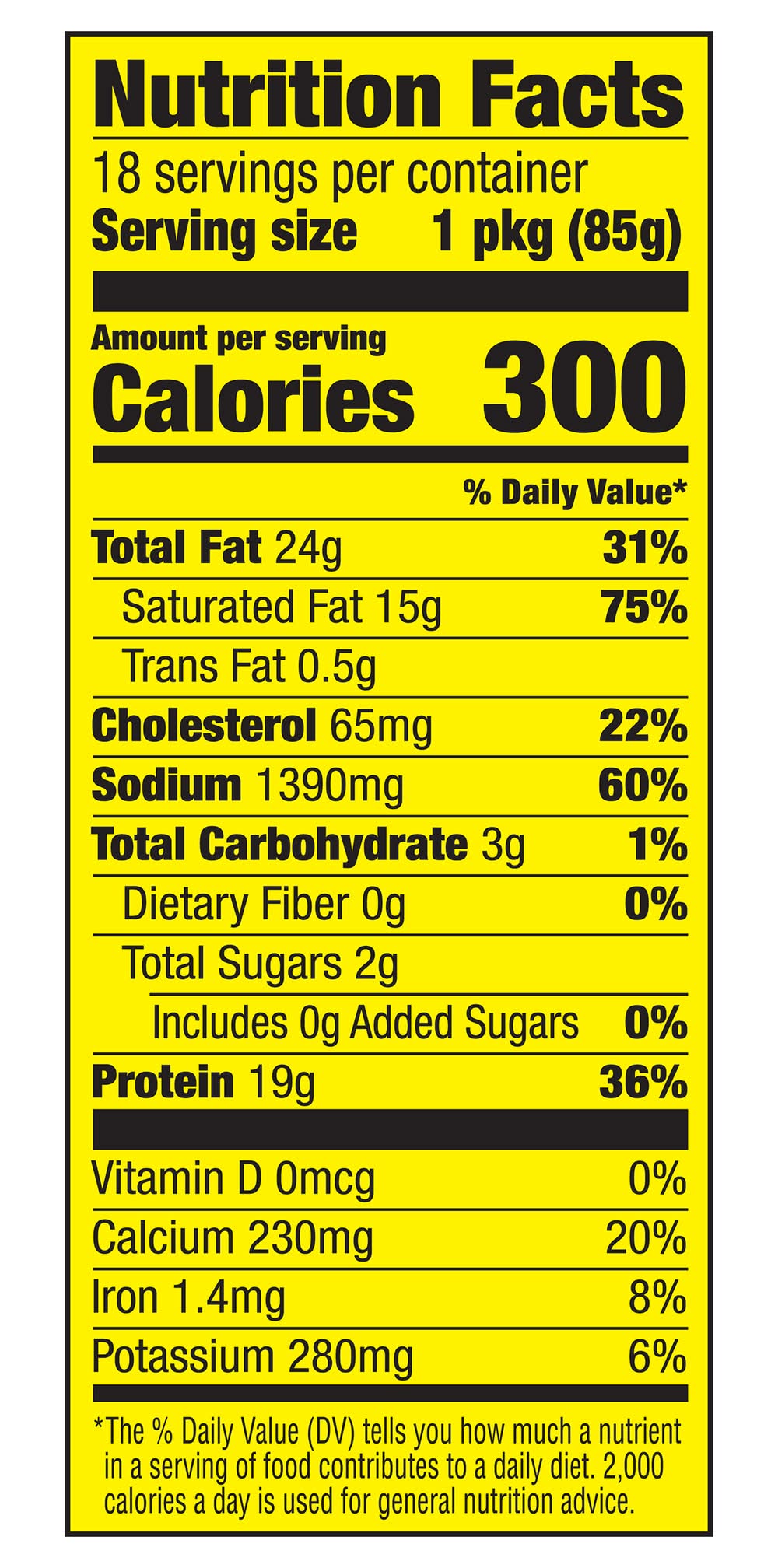 Mild Beef Stick, Smoke Flavor Added (Beef, Salt, Water, Contains Less than 2% of: Corn Syrup, Dextrose, Spices, Natural Smoke Flavor, Natural Flavor, Sodium Erythorbate, Hydrolyzed Soy Protein, Lactic Acid Starter Culture, Sodium Nitrite), Pasteurized Process Cheddar Cheese Stick (Cultured Pasteurized Milk, Water, Salt, Sodium Phosphate, Natural Flavoring, Sorbic Acid [Preservative], Color [Paprika and Turmeric Extract], Enzymes) Contains: Milk, Soybeans, Corn