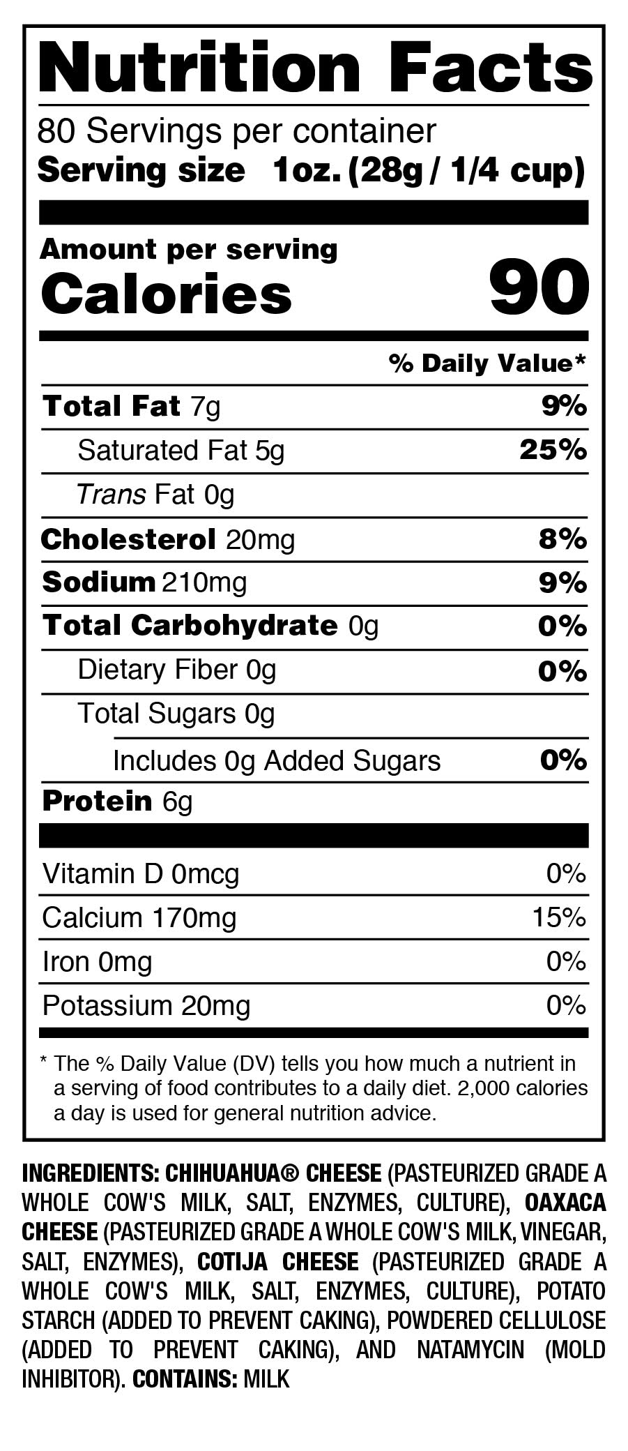 Ingredients: Chihuahua Cheese (Pasteurized Grade "A" Whole Cow'S Milk, Salt, Enzymes, Culture), Oaxaca Cheese (Pasteurized Grade "A" Whole Cow'S Milk, Salt, Enzymes, Culture), Cotija Cheese (Pasteurized Grade "A" Whole Cow'S Milk, Salt, Enzymes, Culture), Potato Starch And Powdered Cellulose Added To Prevent Caking Contains: Milk and its derivates