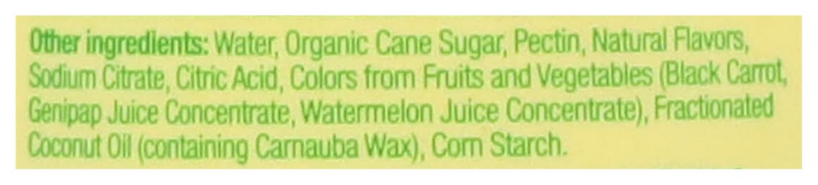 Ingredients: a Proprietary Probiotic Blend Total Cultures, Bacillus Subtilis De111, Bacillus Coagulans Mtcc 5856, Inulin (Chicory Root Extract). Other Ingredients: Water, Organic Cane Sugar, Pectin, Natural Flavors, Sodium Citrate, Citric Acid, Colors from Fruits and Vegetables (Black Carrot, Genipap Juice Concentrate, Watermelon Juice Concentrate), Fractionated Coconut Oil (Containing Carnauba Wax), Corn Starch Contains: Tree Nuts, Coconuts, Corn